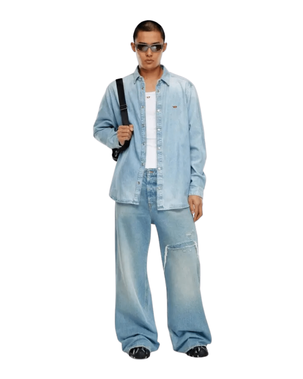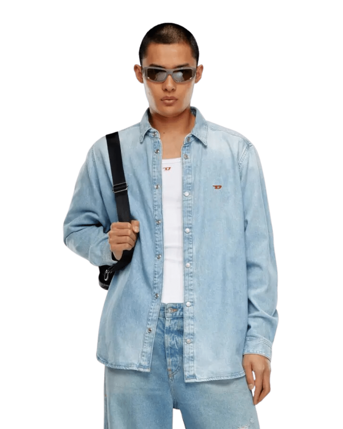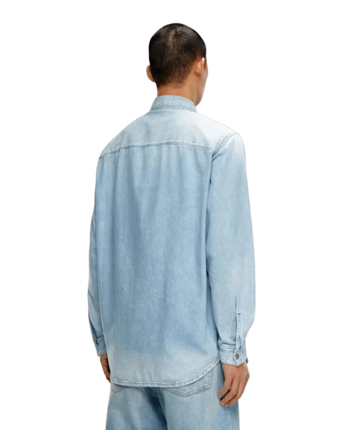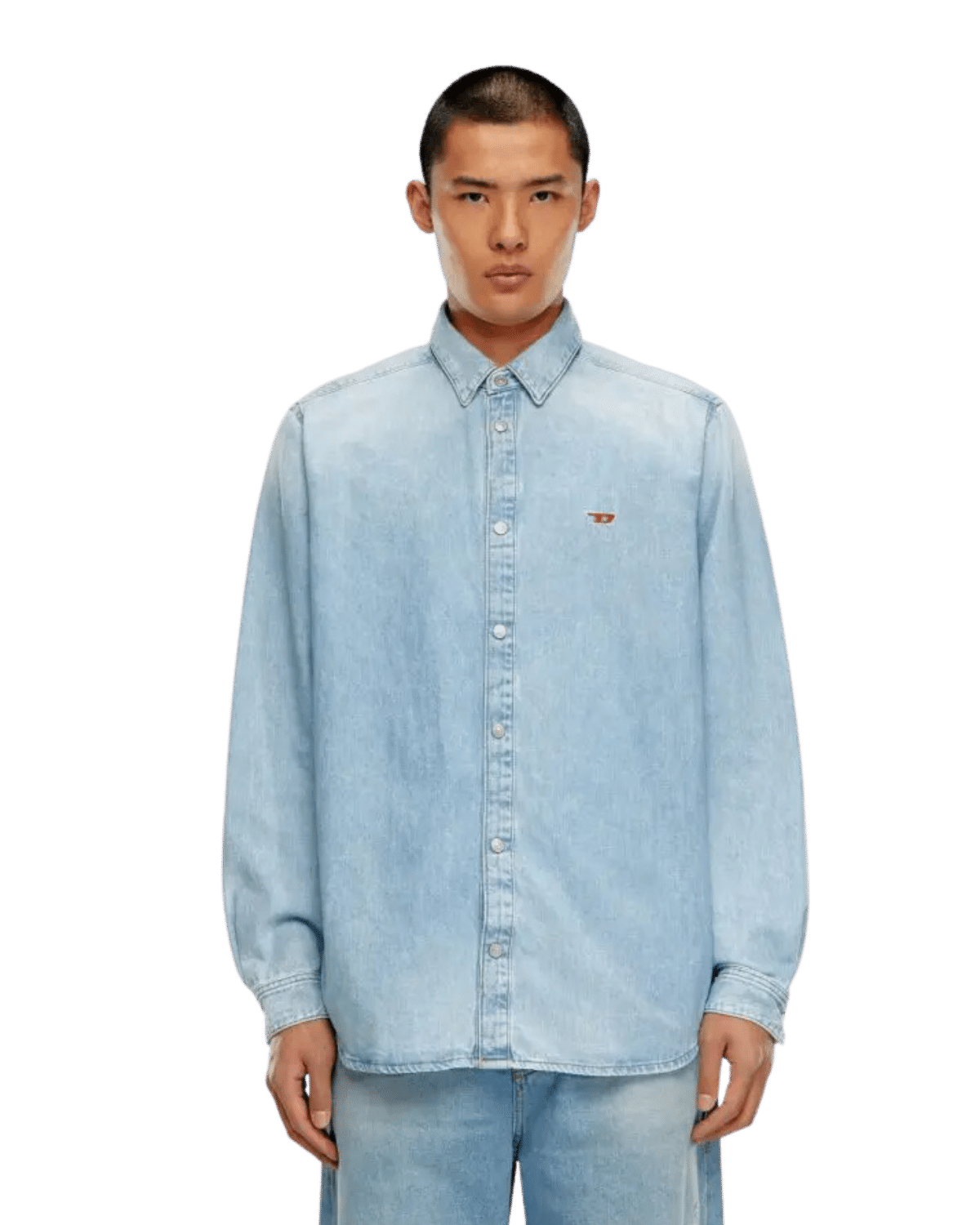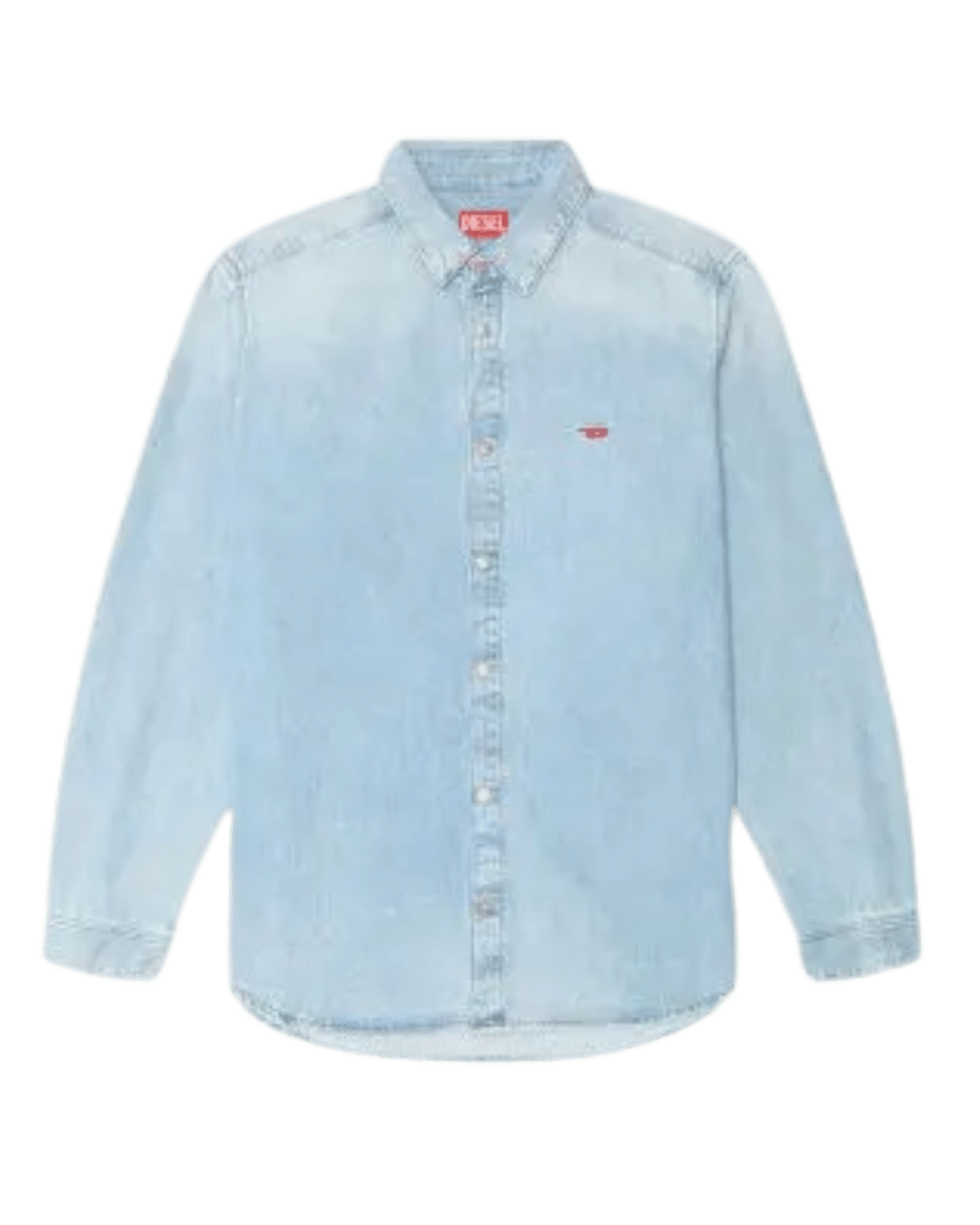 חולצת דנים מכופתרת ארוכה בצבע כחול בהיר במראה דהוי, עם רקמת לוגו קטנה