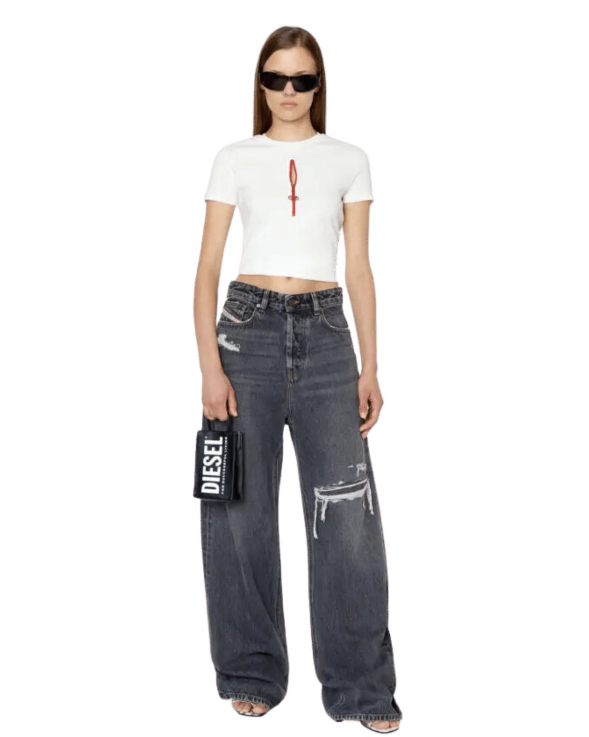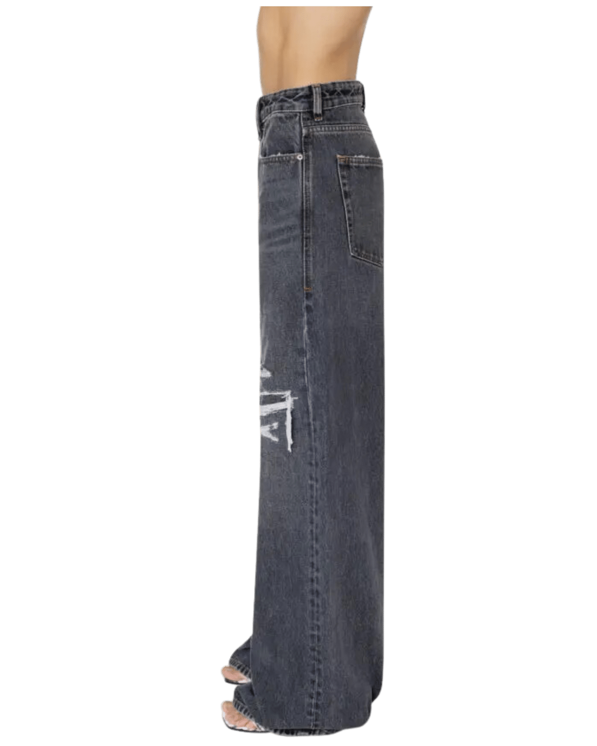 ג׳ינס, צבע אפור כהה, גזרה נמוכה, רחבה וישרה, קרעים
