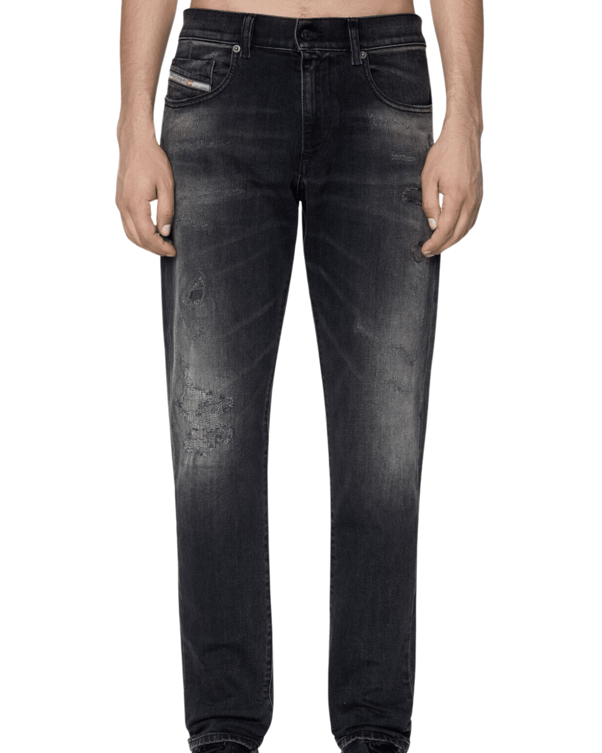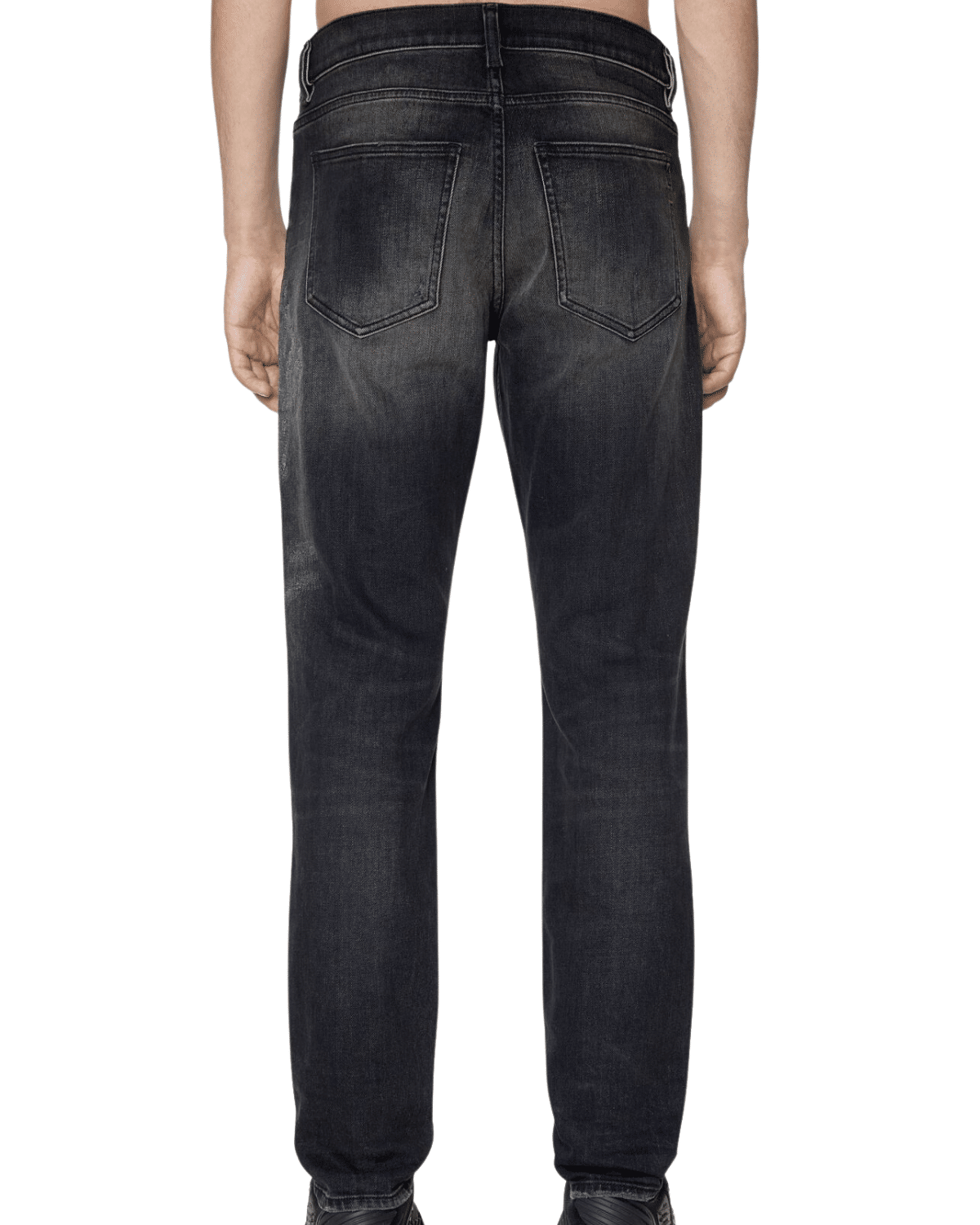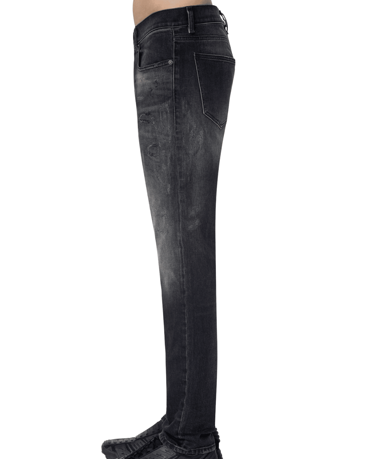 ג׳ינס שחור עם שפשופים בגזרה צרה וישרה.