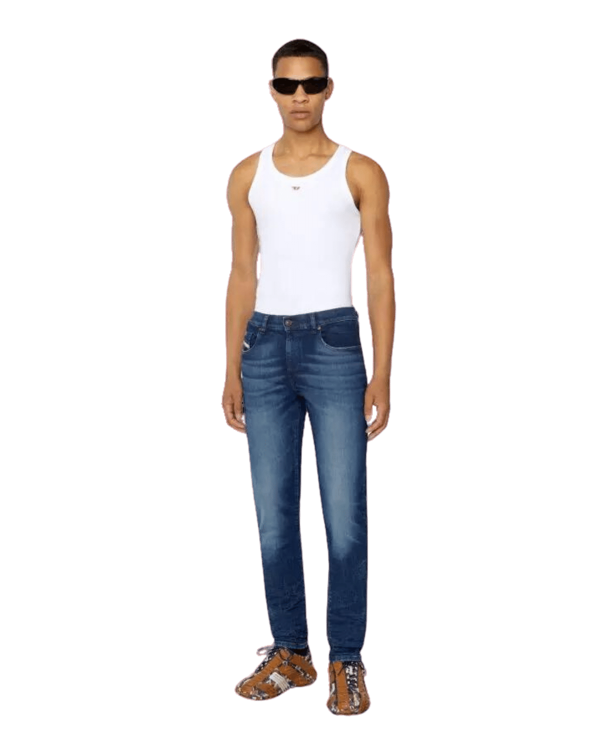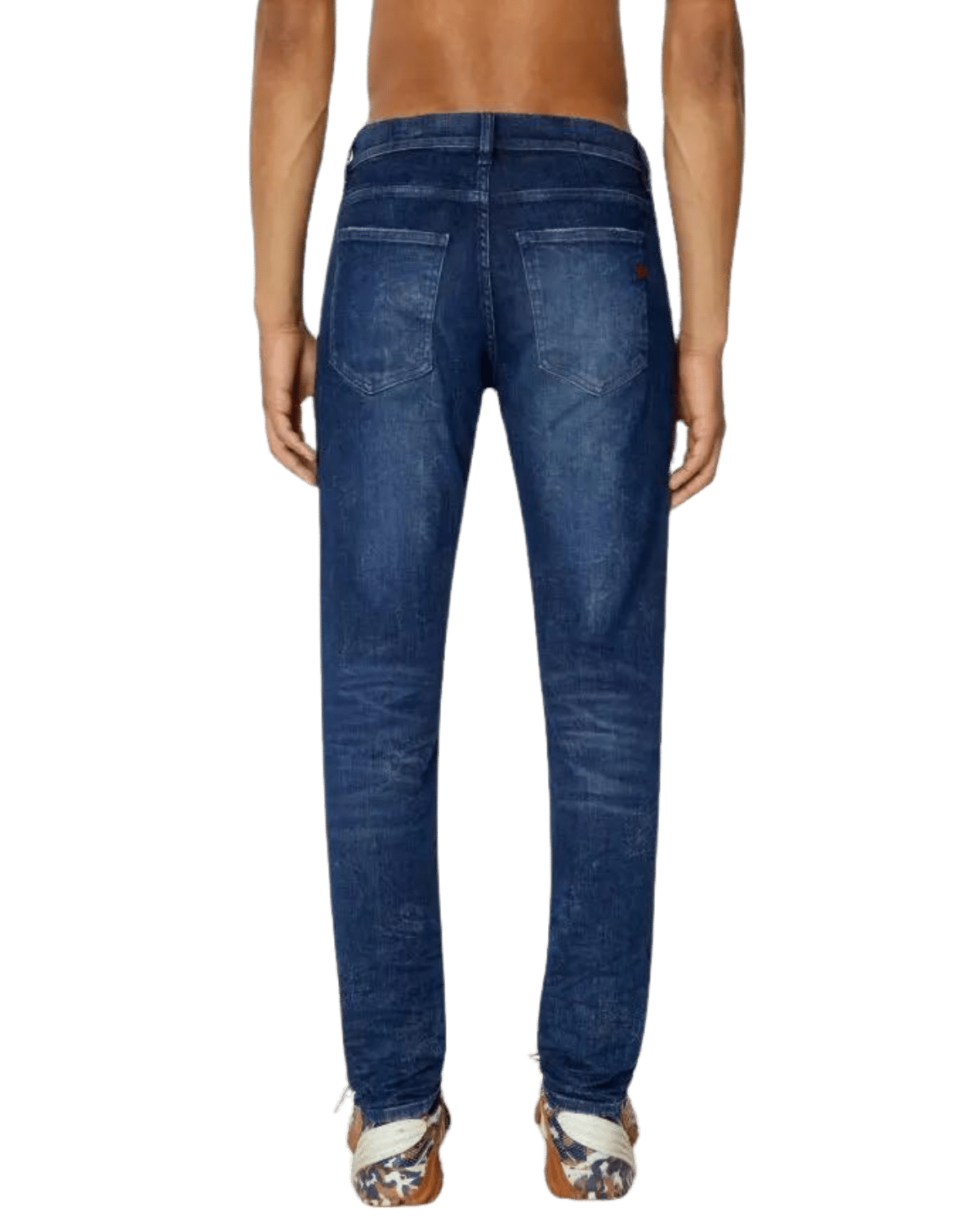 ג׳ינס כחול משופשף בגזרה צרה וישרה (סלים) עם פאץ׳ לוגו על הכיס הקדמי הקטן (2019 D-STRUKT)