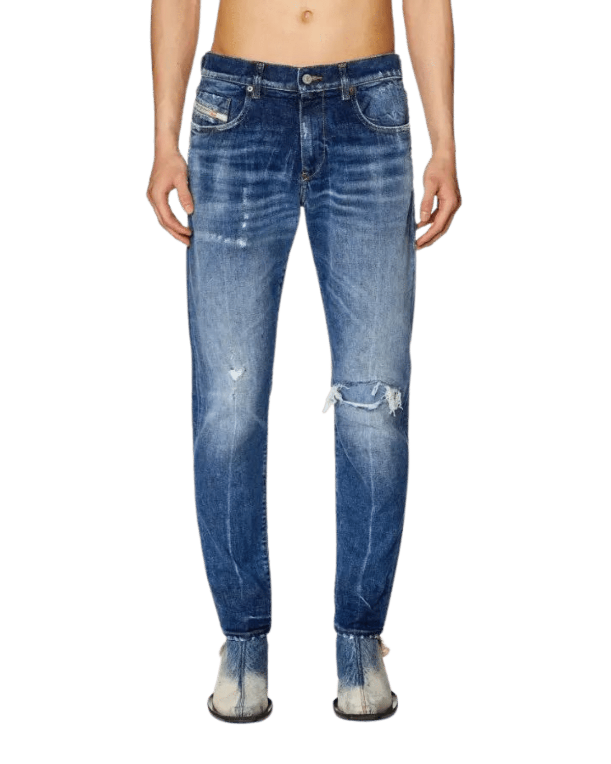ג׳ינס כחול בגזרה צרה וישרה עם שפשופים וקרעים