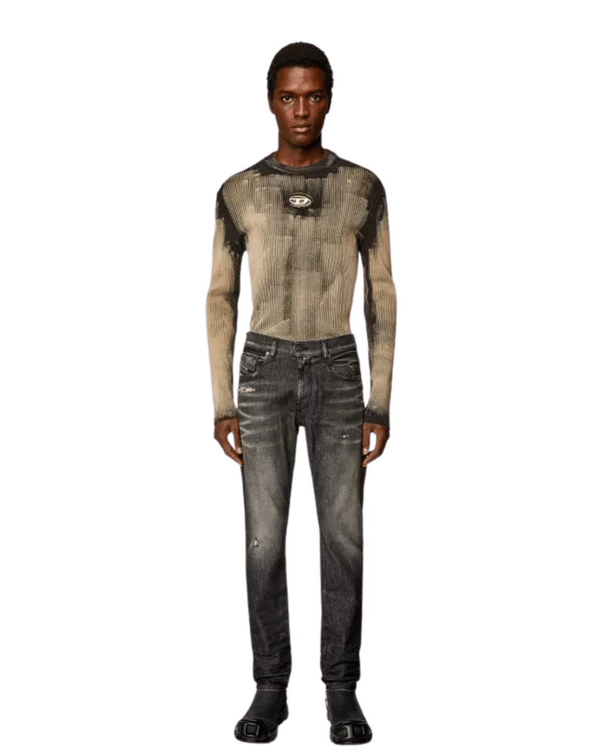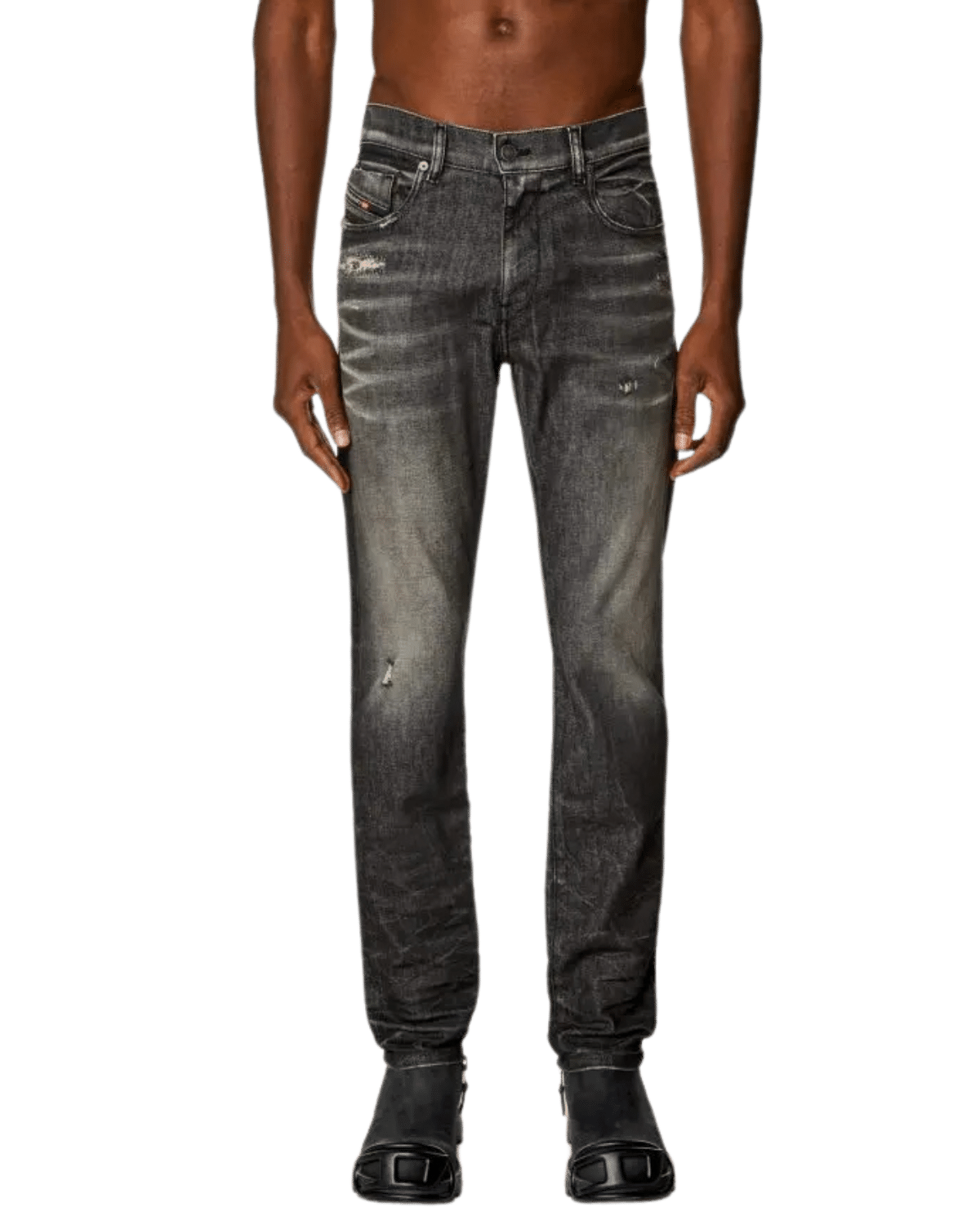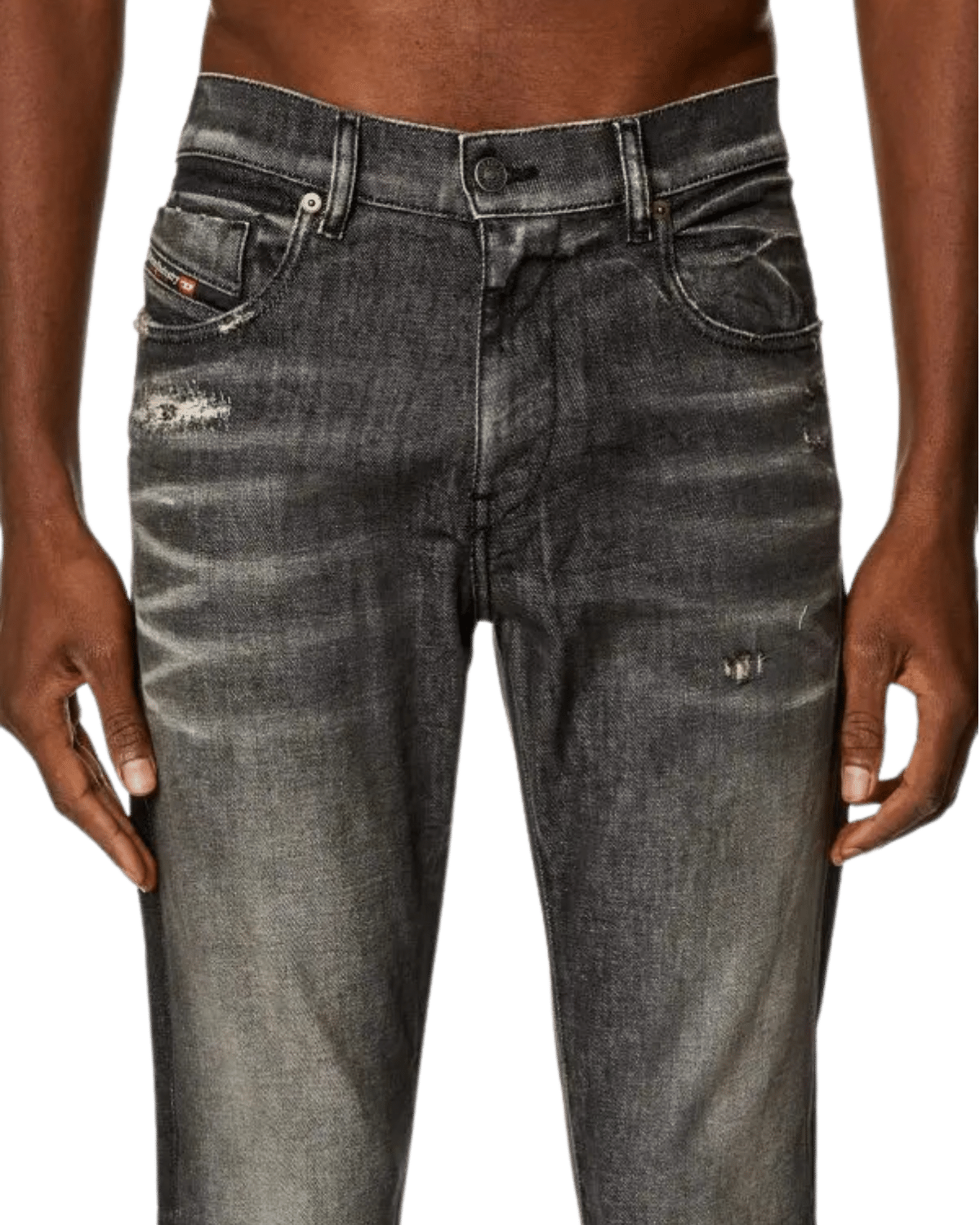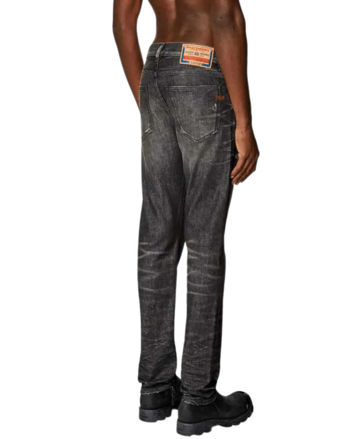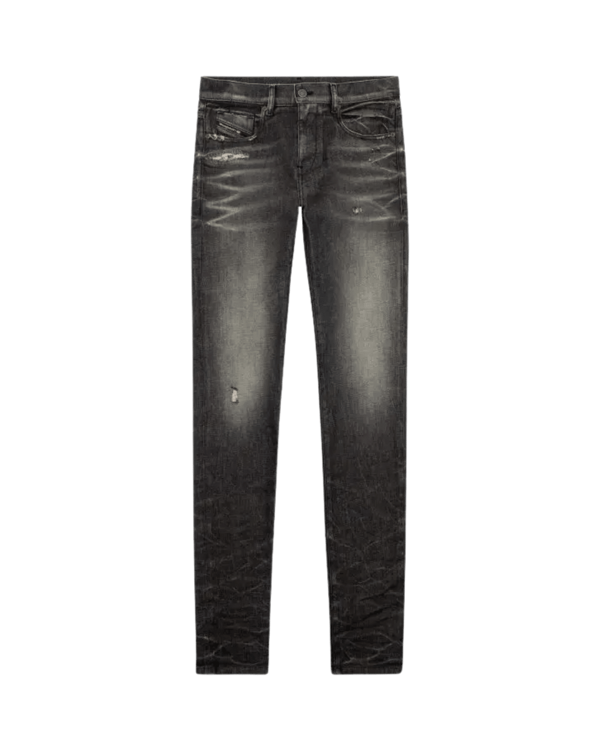 ג׳ינס אפור כהה בגזרה צרה וישרה, עם שפשופים וקרעים קטנים לאורך הרגליים.