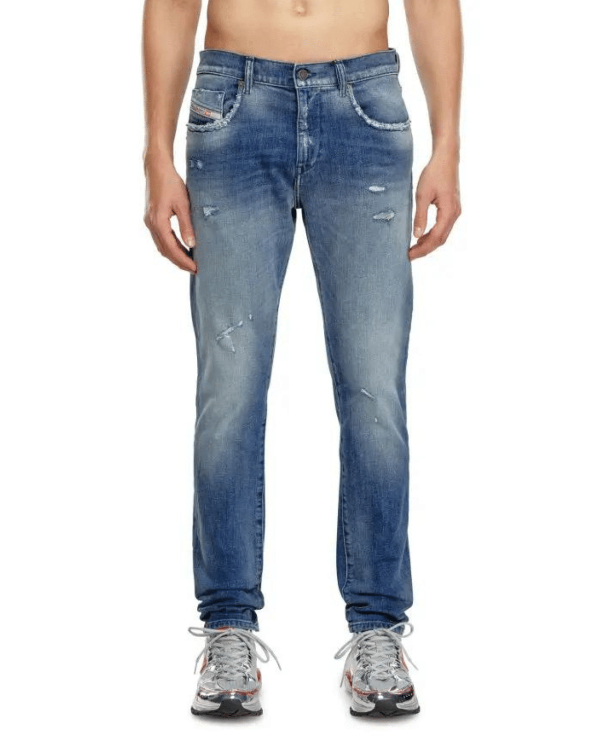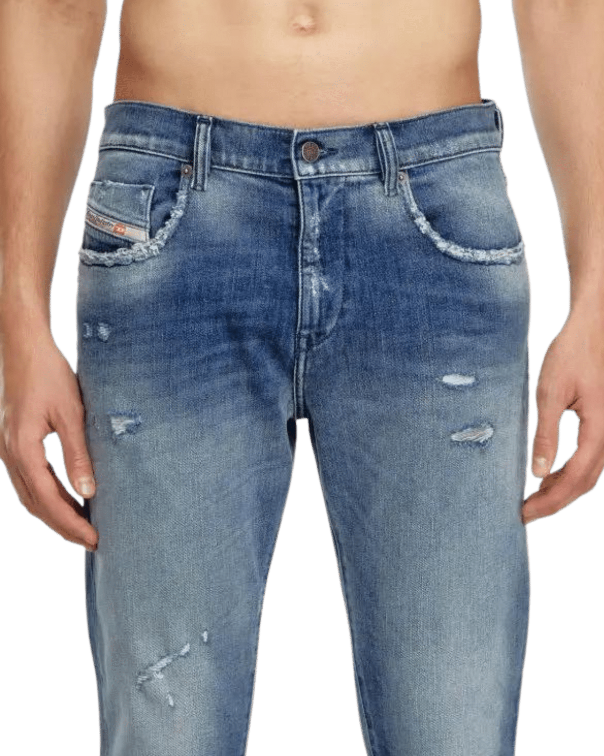 ג׳ינס כחול בגזרה צרה וישרה עם שפשופים וקרעים קטנים. 2019 D-Strukt 09J61