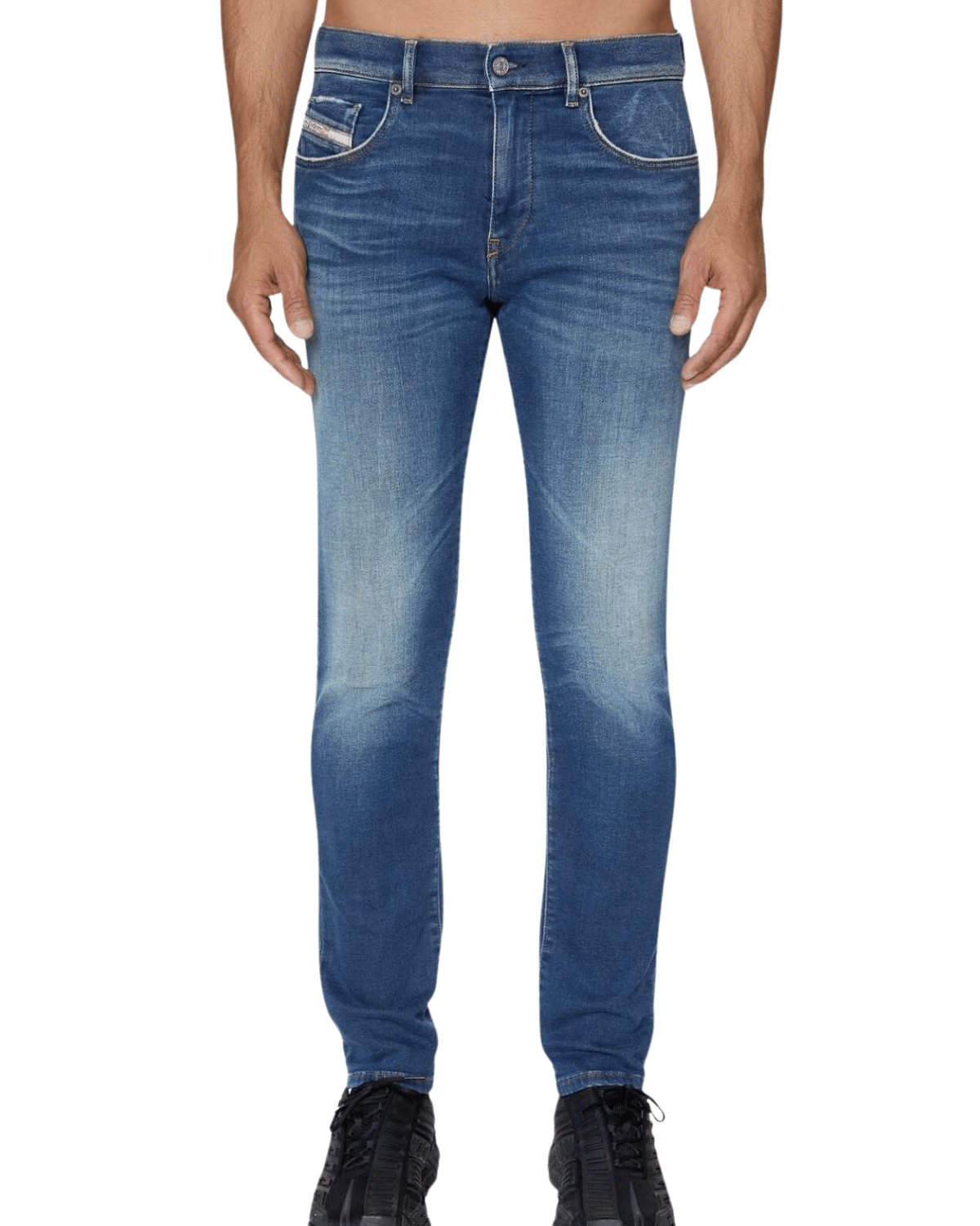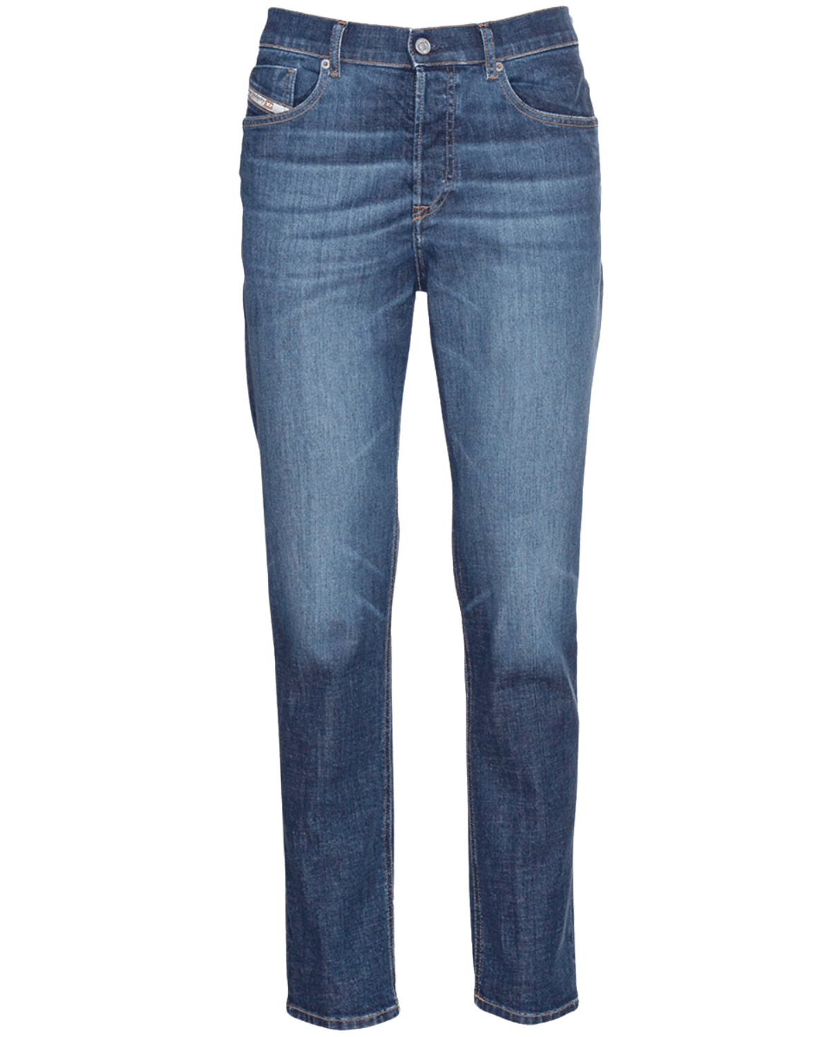 ג׳ינס כחול בגזרה צרה וישרה מבד ג׳וג ג׳ינס נעים ונוח, עם שפשופים.