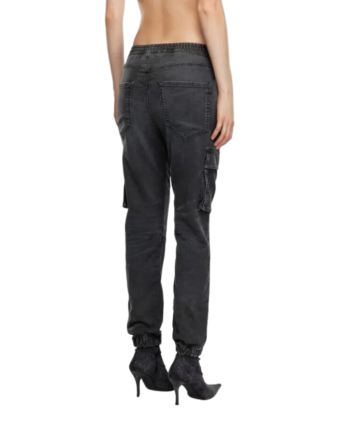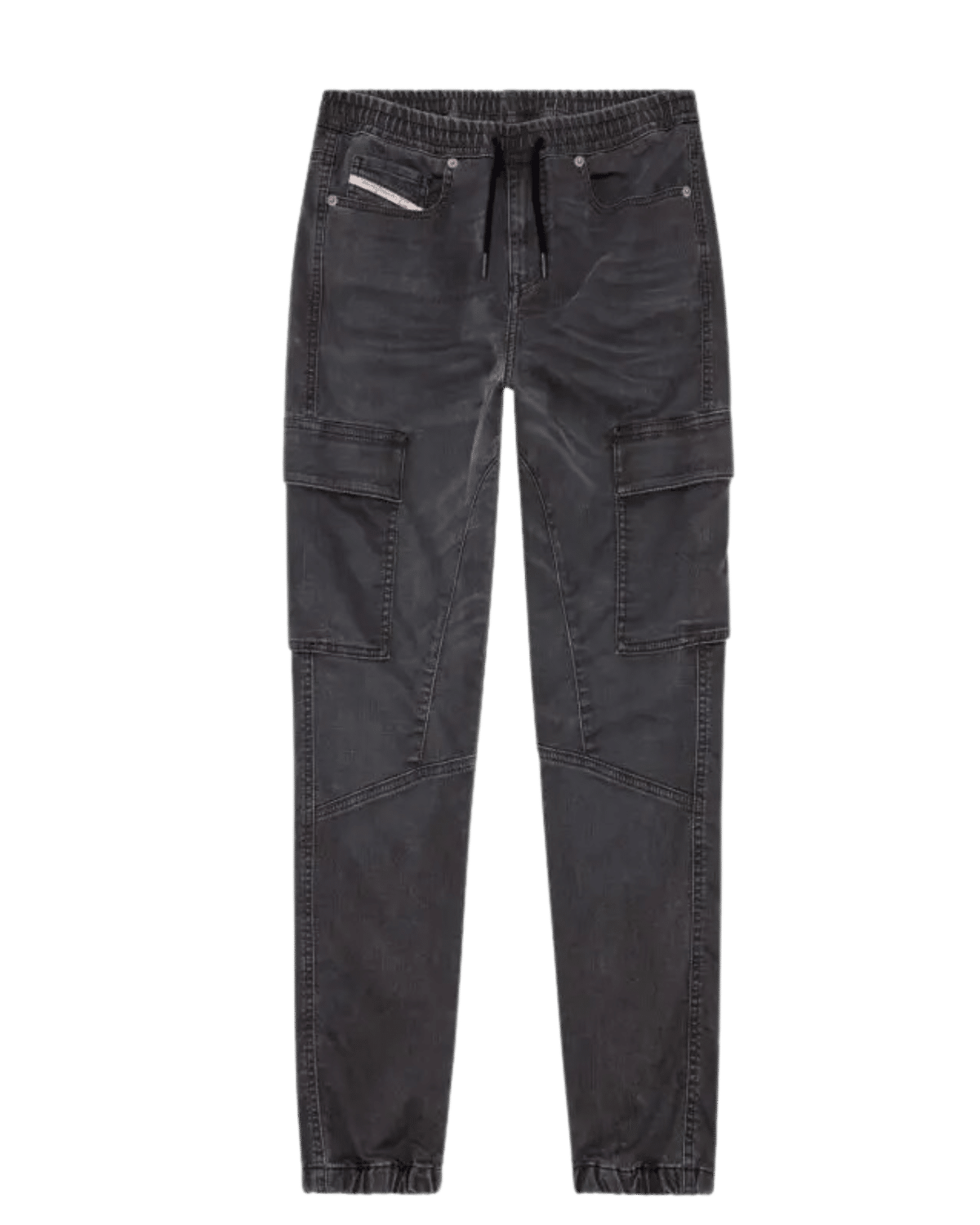 ג׳ינס אפור כהה מבד ג׳וג ג׳ינס נעים ונוח, בגזרה צרה עם כיסי דגמ״ח, גומי במותניים ושרוך קשירה.
