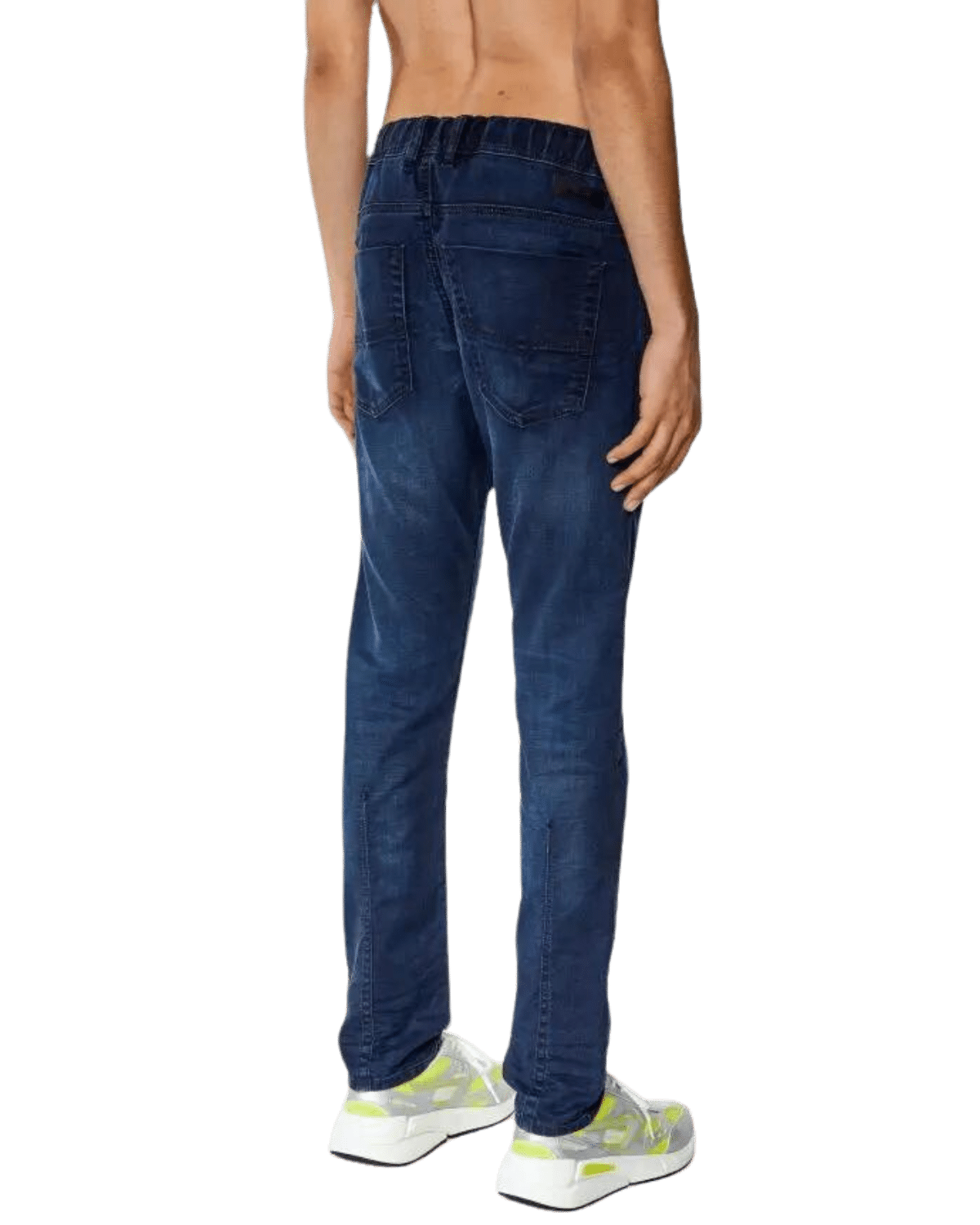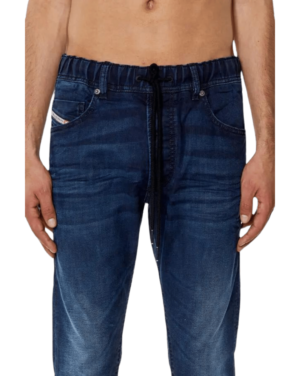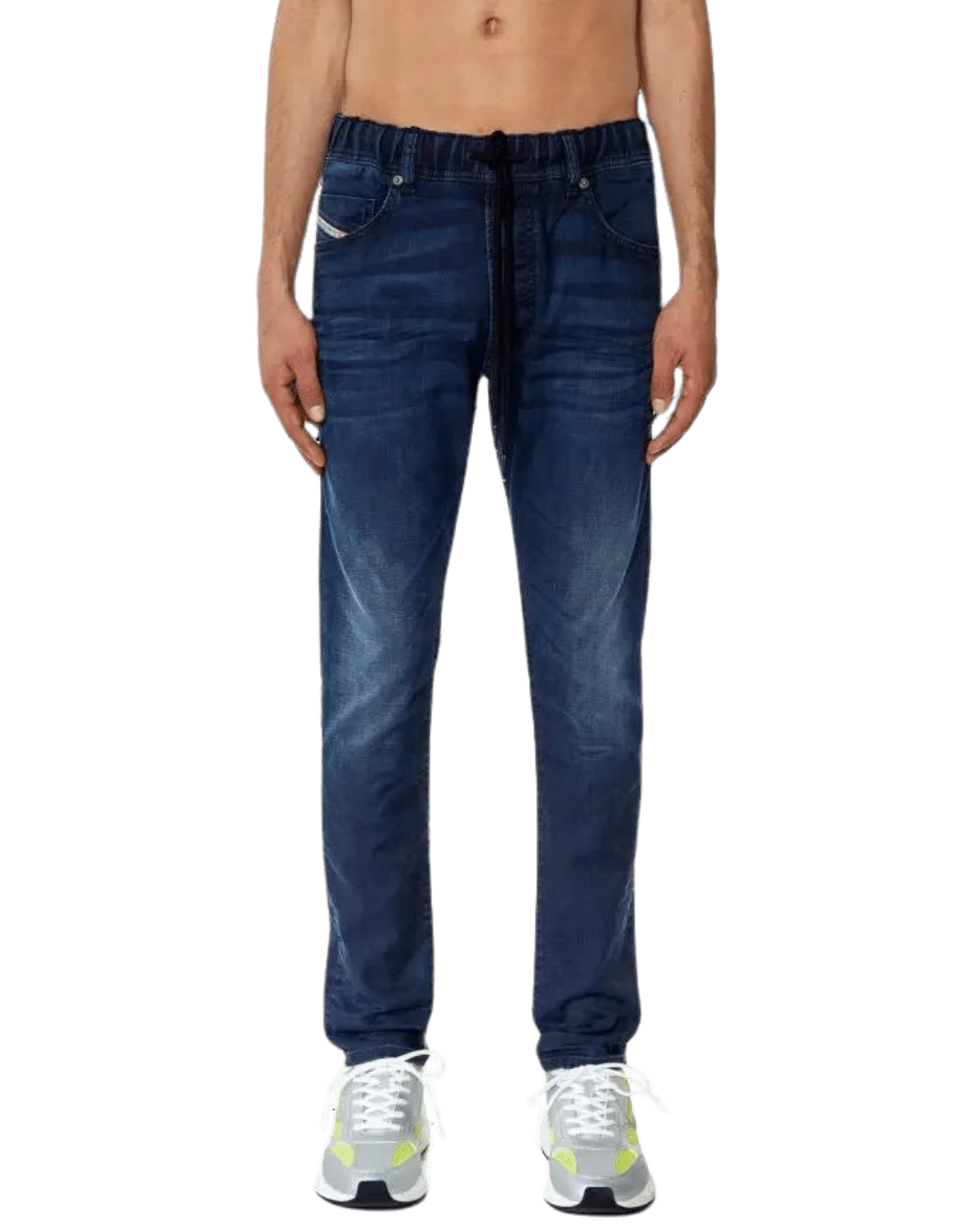 ג׳ינס ג׳וג מבד נעים ונוח בצבע כחול כהה ובגזרה ישרה עם הצרה קלה בתחתית. לג׳ינס גומי במותן ושרוך קשירה