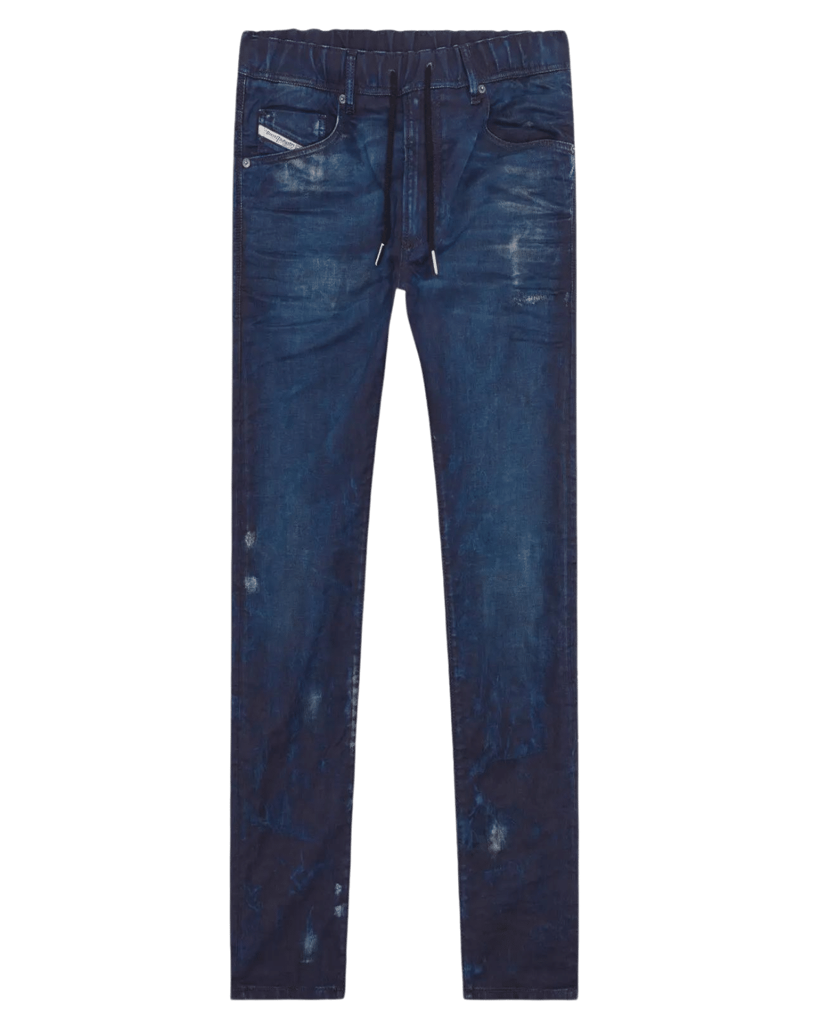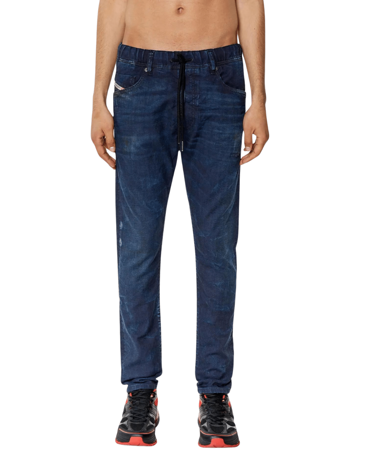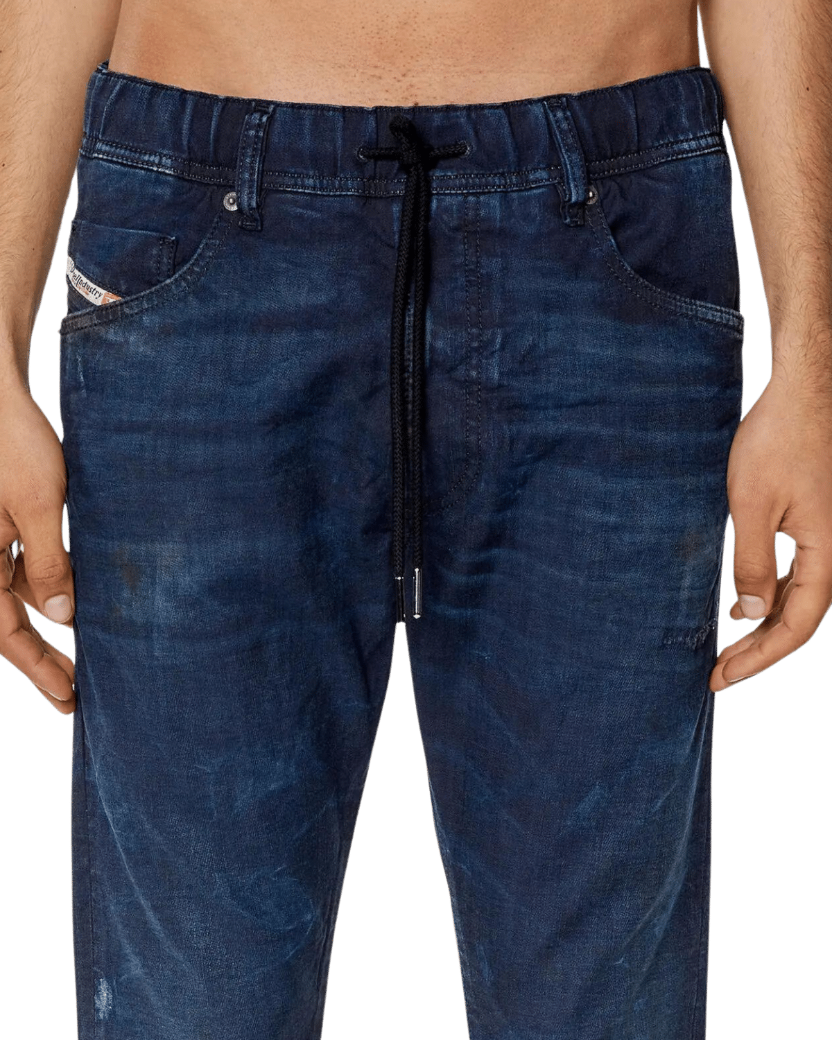 ג׳ינס ג׳וג מבד נעים ונוח בצבע כחול כהה ובגזרה ישרה עם הצרה קלה בתחתית. לג׳ינס גומי במותן ושרוך קשירה.