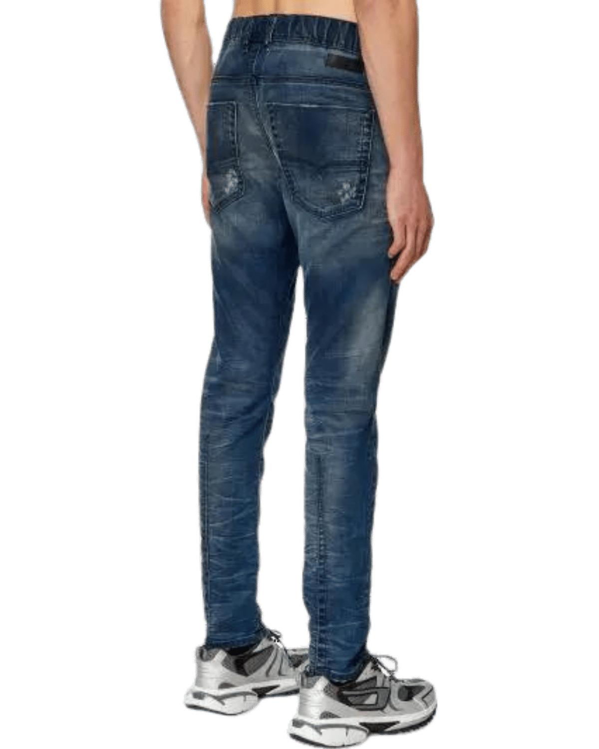 ג׳ינס כחול כהה מבד ג׳וג ג׳ינס נעים ונוח, בגזרה מעט משוחררת במותניים והירכיים וצרה בקרסוליים, עם גומי ושרוך קשירה.