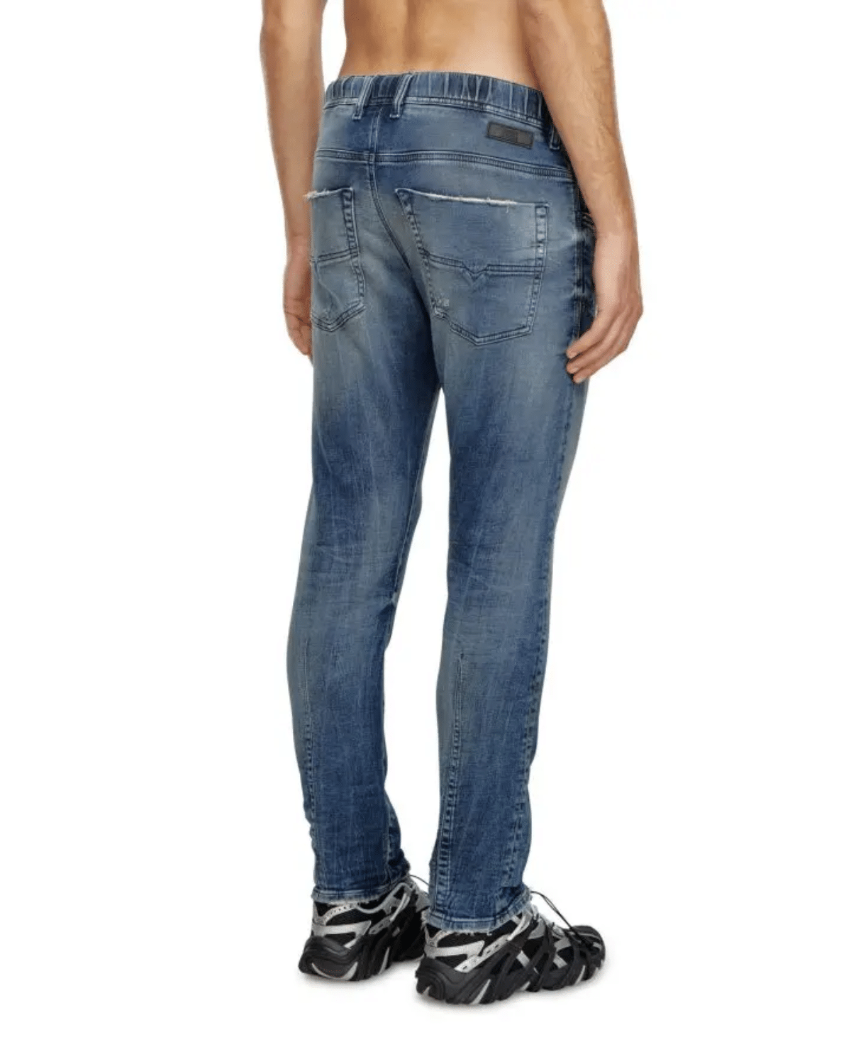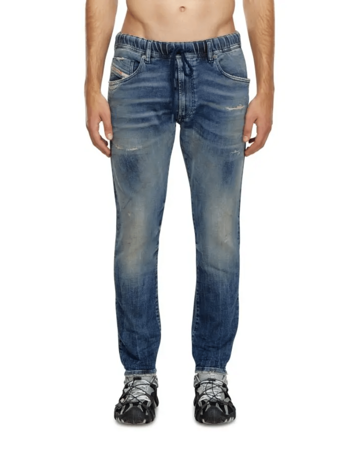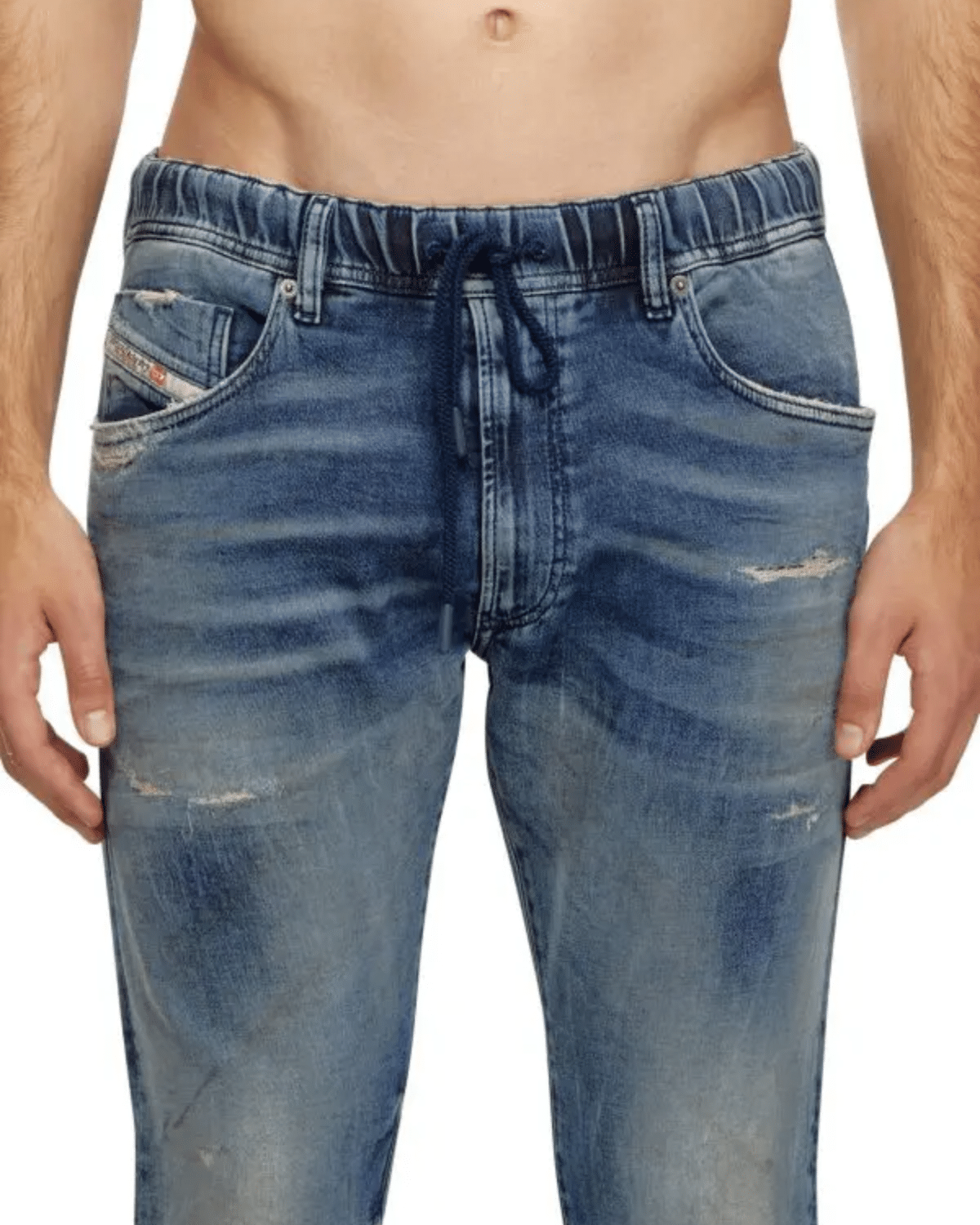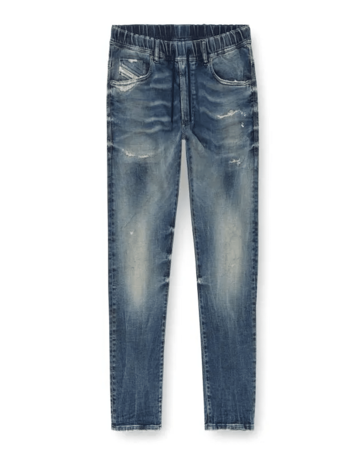 ג׳ינס כחול מבד ג׳וג ג׳ינס נעים ונוח, בגזרה מעט משוחררת במותניים והירכיים וצרה בקרסוליים, עם גומי ושרוך קשירה.