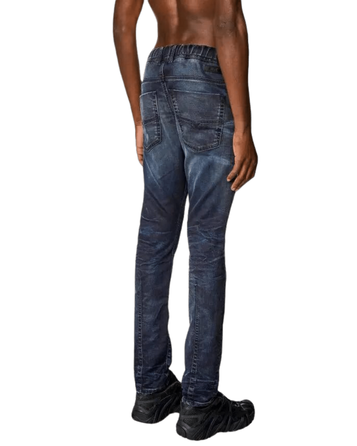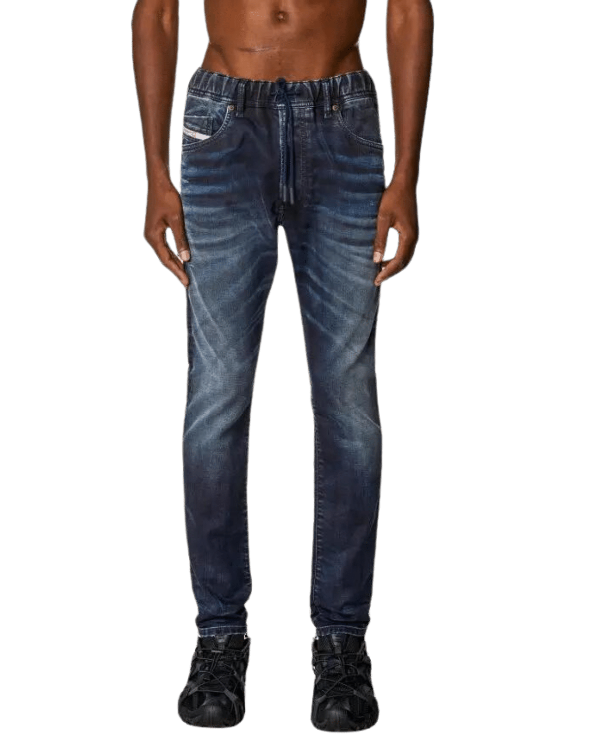 ג׳ינס כחול כהה מבד ג׳וג ג׳ינס נעים ונוח, בגזרה מעט משוחררת במותניים והירכיים וצרה בקרסוליים, עם גומי ושרוך קשירה