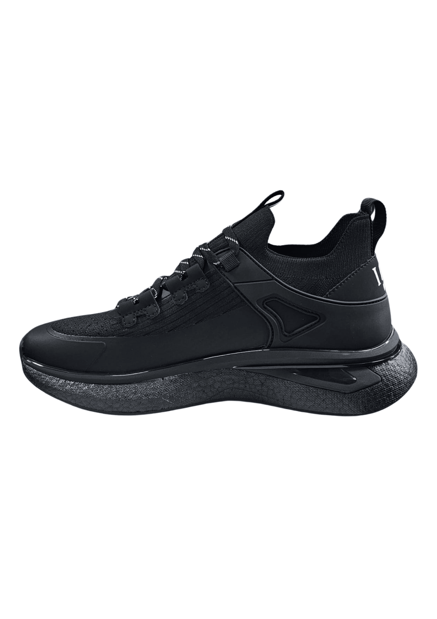 נעלי סניקרס לגברים בעיצוב אורבני מתקדם עם נוכחות חזקה בצבע שחור מלא.