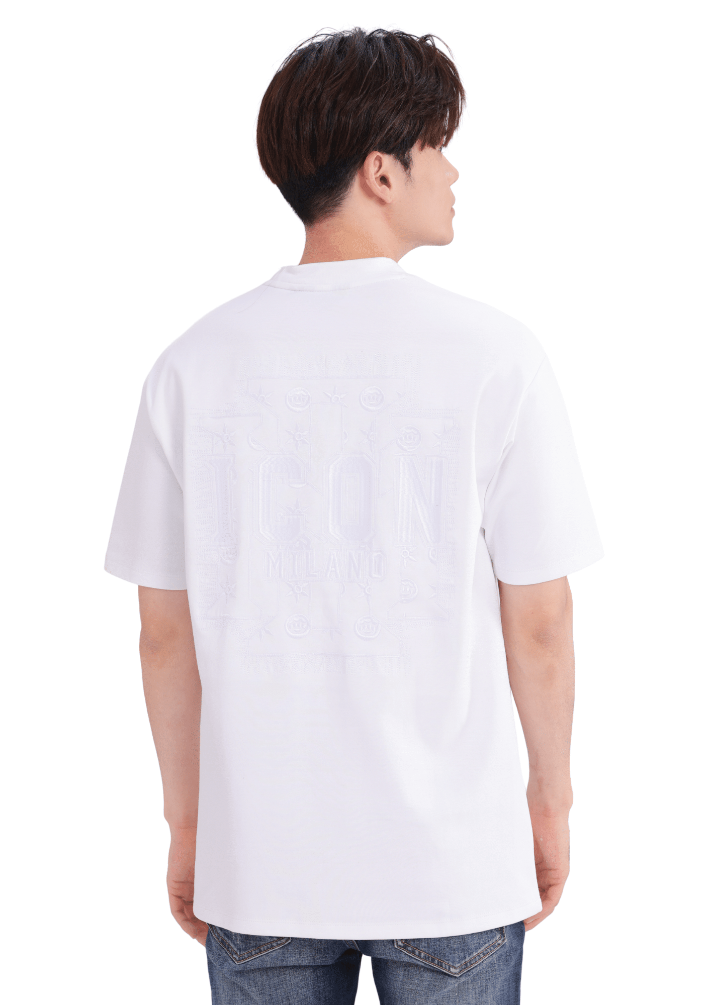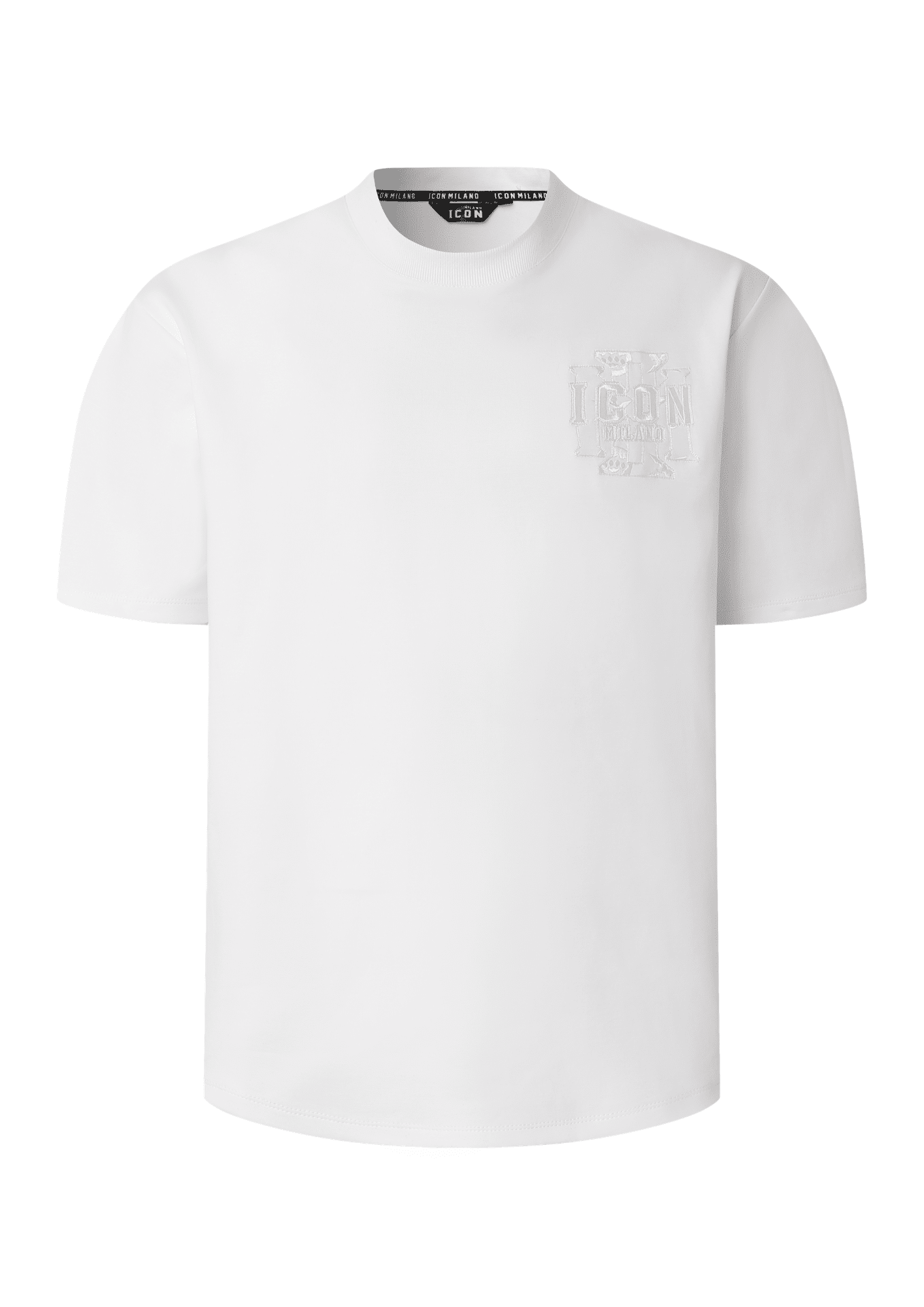 חולצת טי לגברים מבית ICON MILANO בעיצוב לבן נקי עם לוגו עדין בחזית והדפס אחורי גדול בטכניקת טון-על-טון למראה יוקרתי ושקט.
