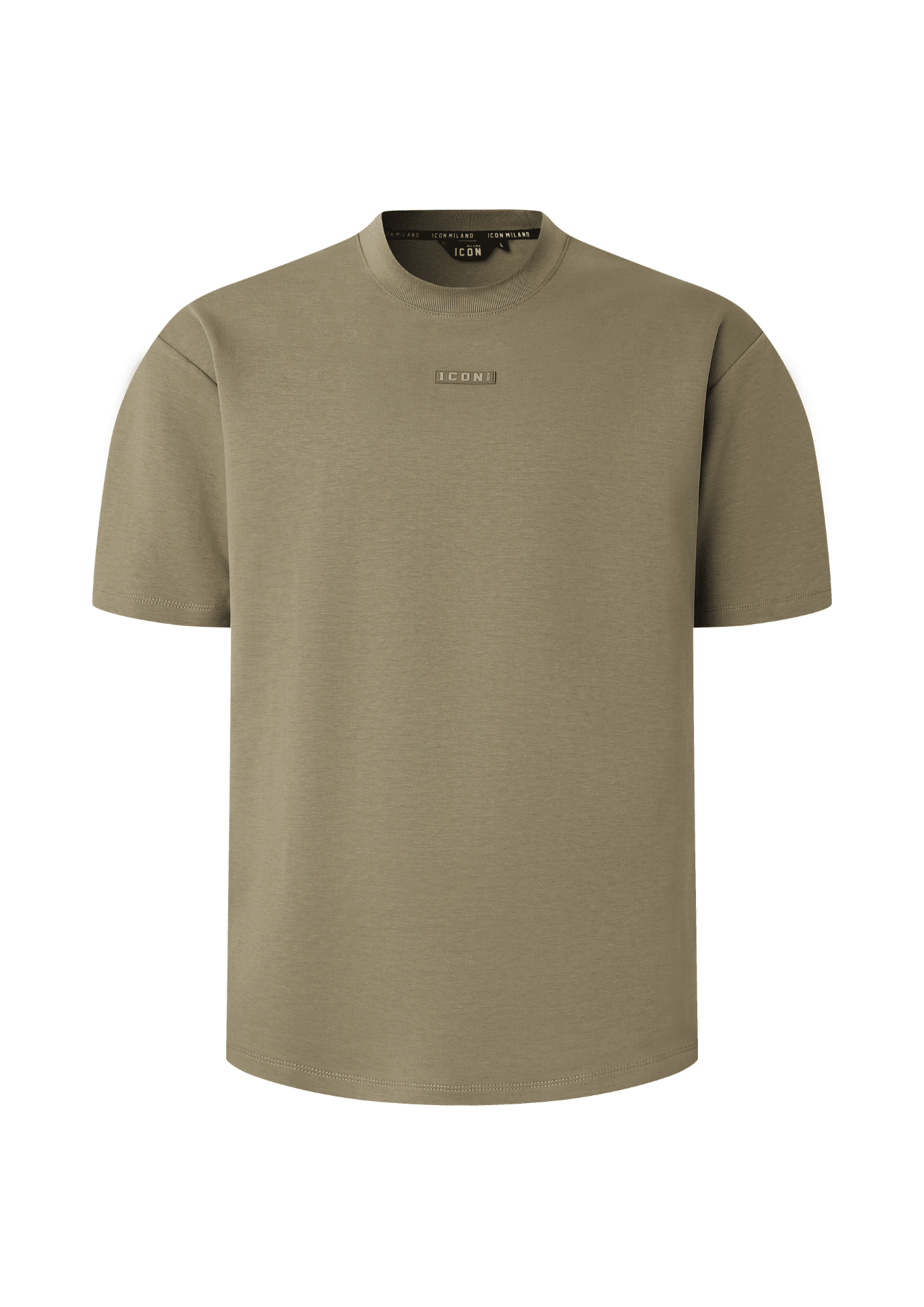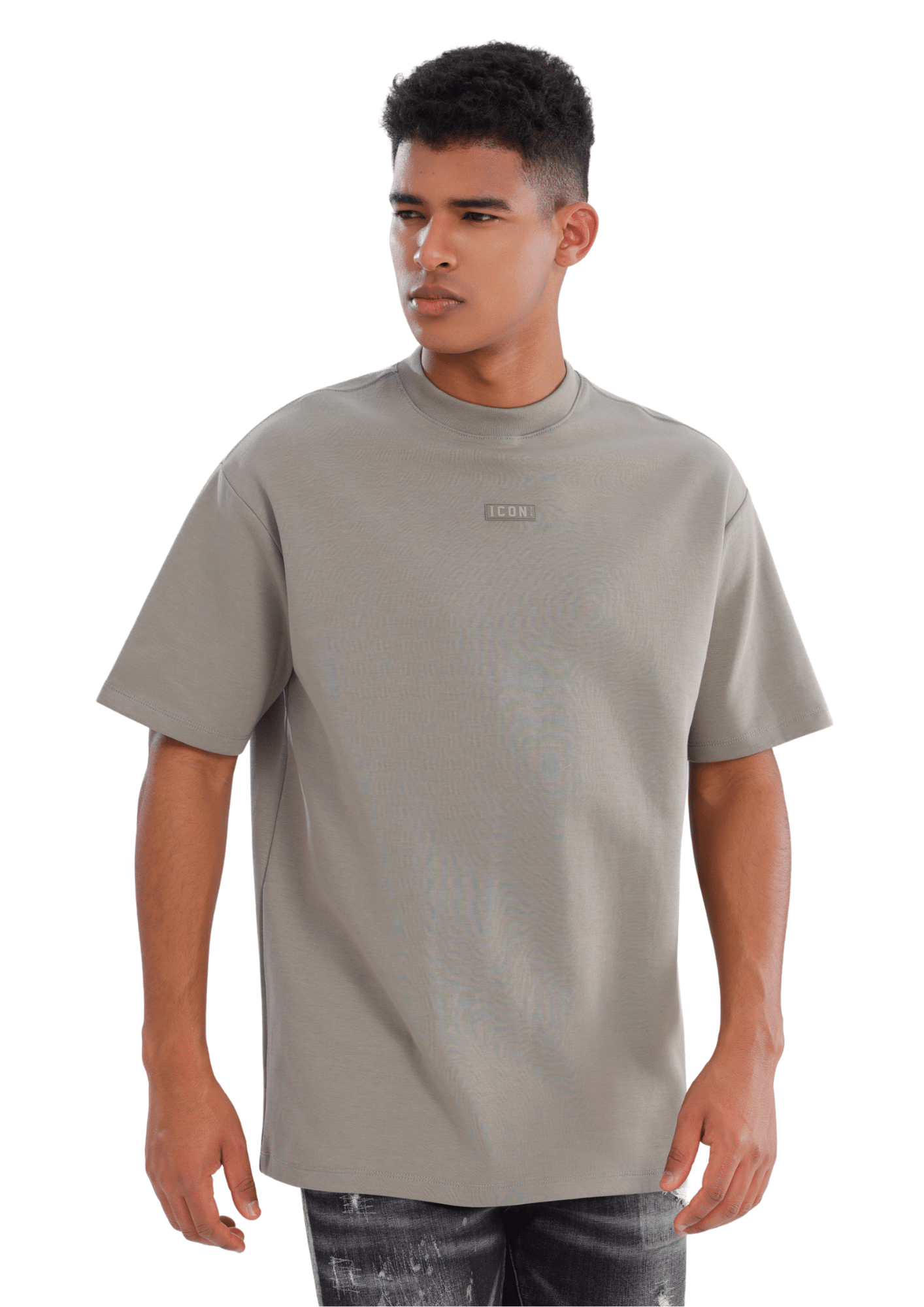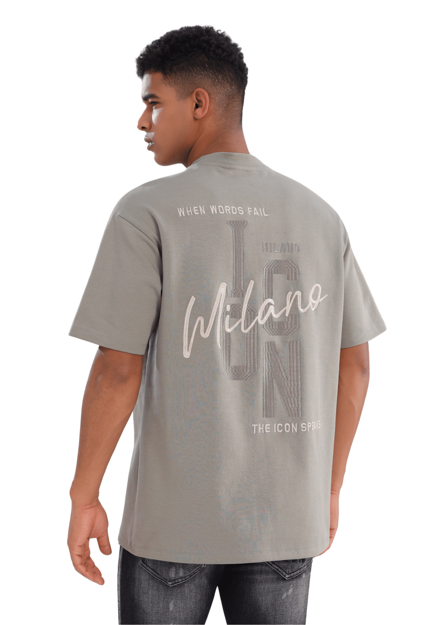 חולצת טי לגברים מבית ICON MILANO בעיצוב נקי מקדימה עם לוגו מינימלי, ובחלק האחורי הדפס גדול ומרשים בסגנון אורבני.