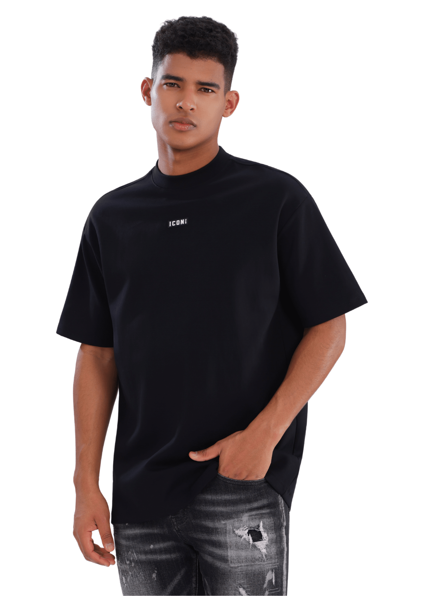 חולצת טי לגברים מבית ICON MILANO בעיצוב נקי מקדימה עם לוגו מינימלי, ובחלק האחורי הדפס גדול ומרשים בסגנון אורבני.