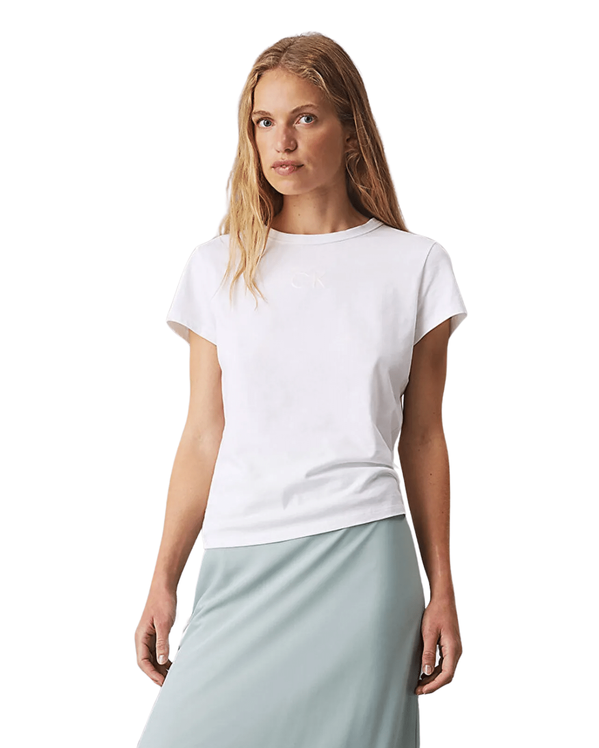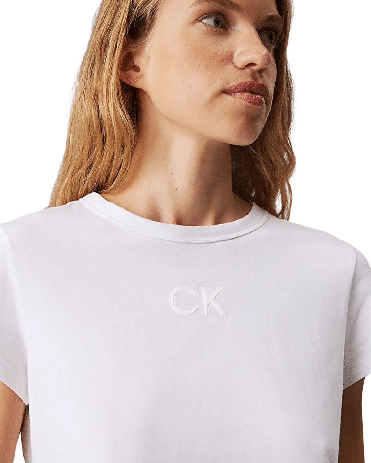 חולצה קצרה מבית Calvin Klein בצבע לבן, המעוצבת בקווים נקיים ומראה מודרני שמתאים לכל אירוע.
