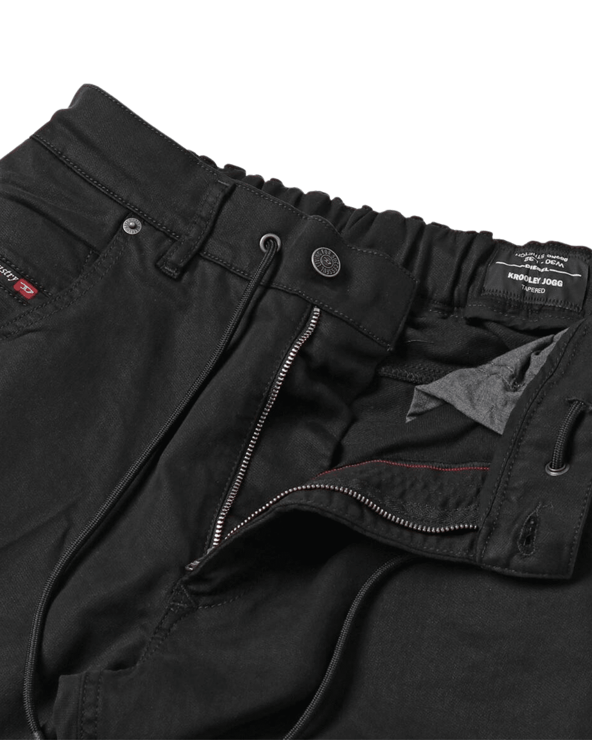 מכנס ג’וג בגזרה צרה, בצבע שחור חלק. למכנס חגורת גומי אלסטית ושרוך. המכנס הוא שילוב ייחודי וראשון מסוגו המשלב תפירה בצורת שתי וערב של שני סוגי בד- פוטר ודנים, לנוחות מירבית.