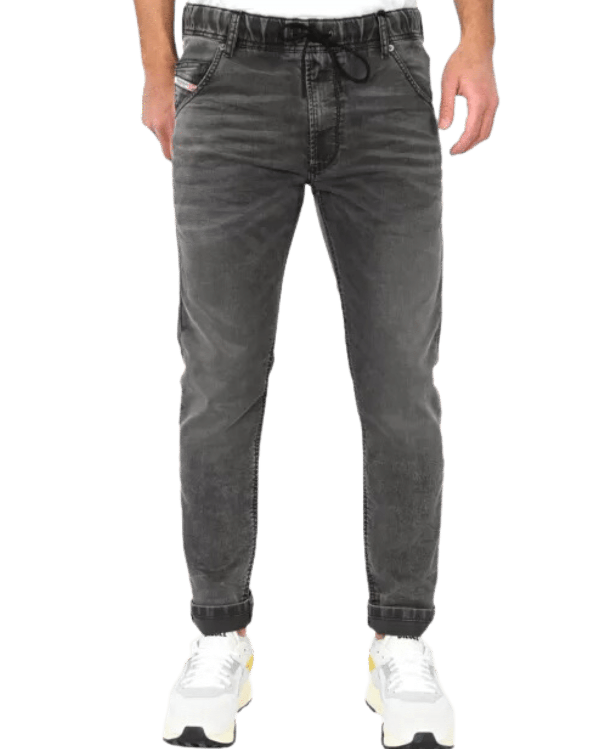 ג׳ינס ג׳וג אפור מבד נעים ונוח בגזרה ישרה עם הצרה קלה בתחתית, גומי במותן ושרוך קשירה.