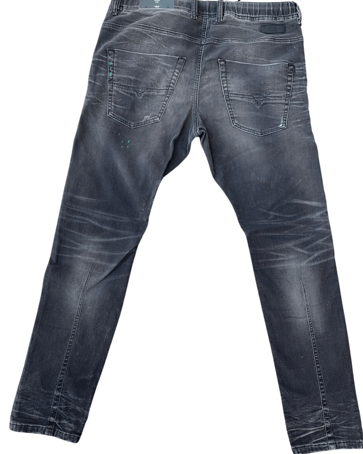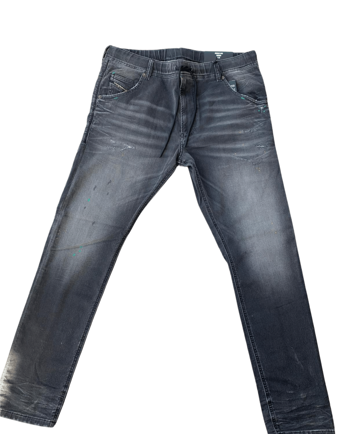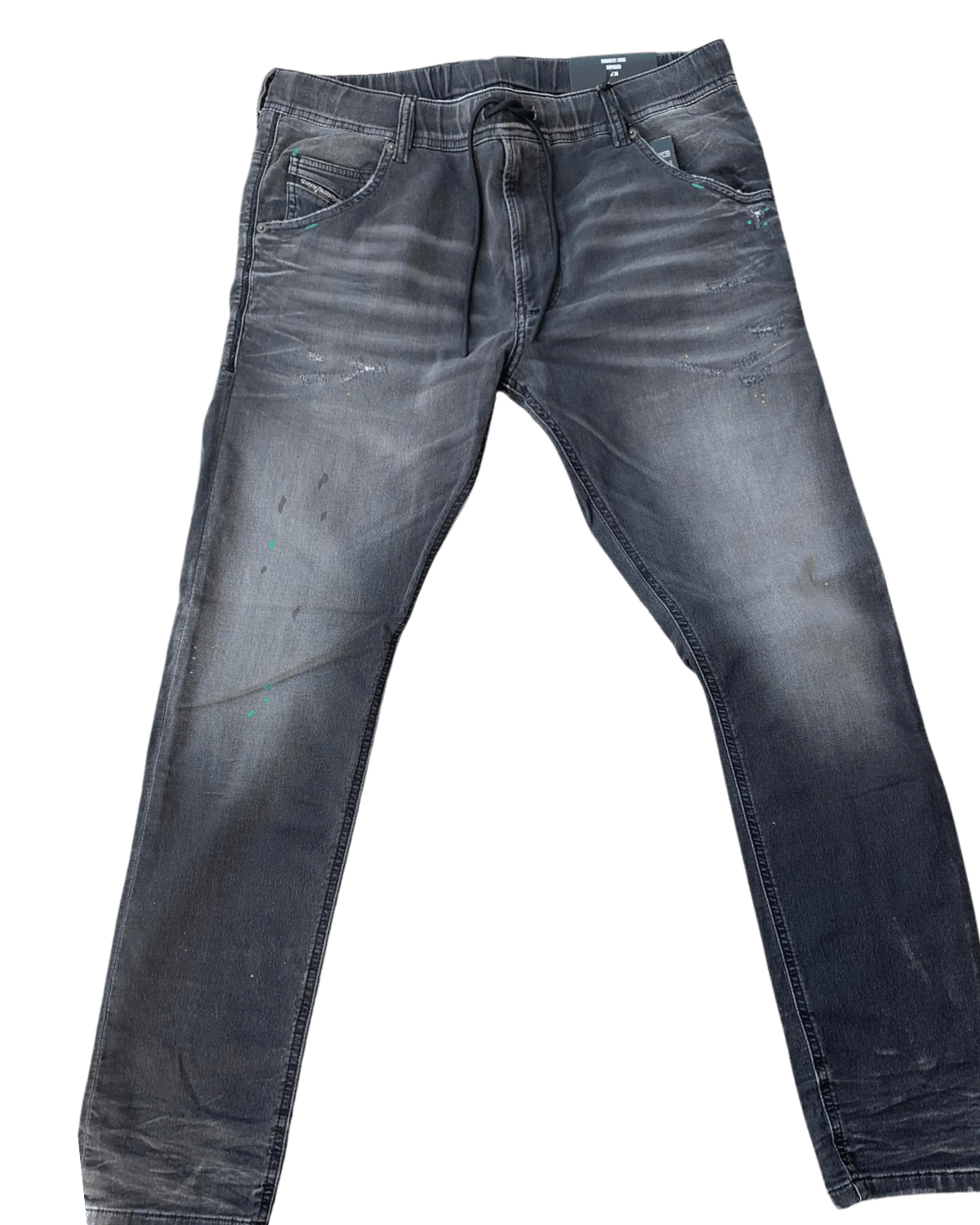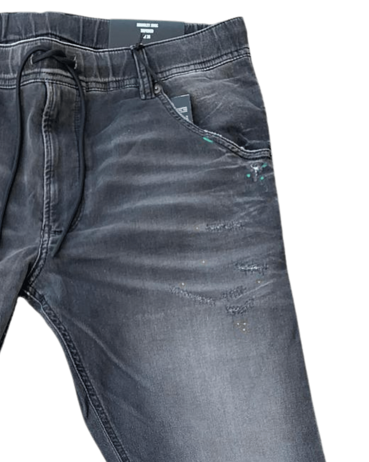 ג׳ינס ג׳וג מבד נעים ונוח בצבע שחור עם נתזי צבע, בגזרה ישרה עם הצרה קלה בתחתית. לג׳ינס גומי במותן ושרוך קשירה