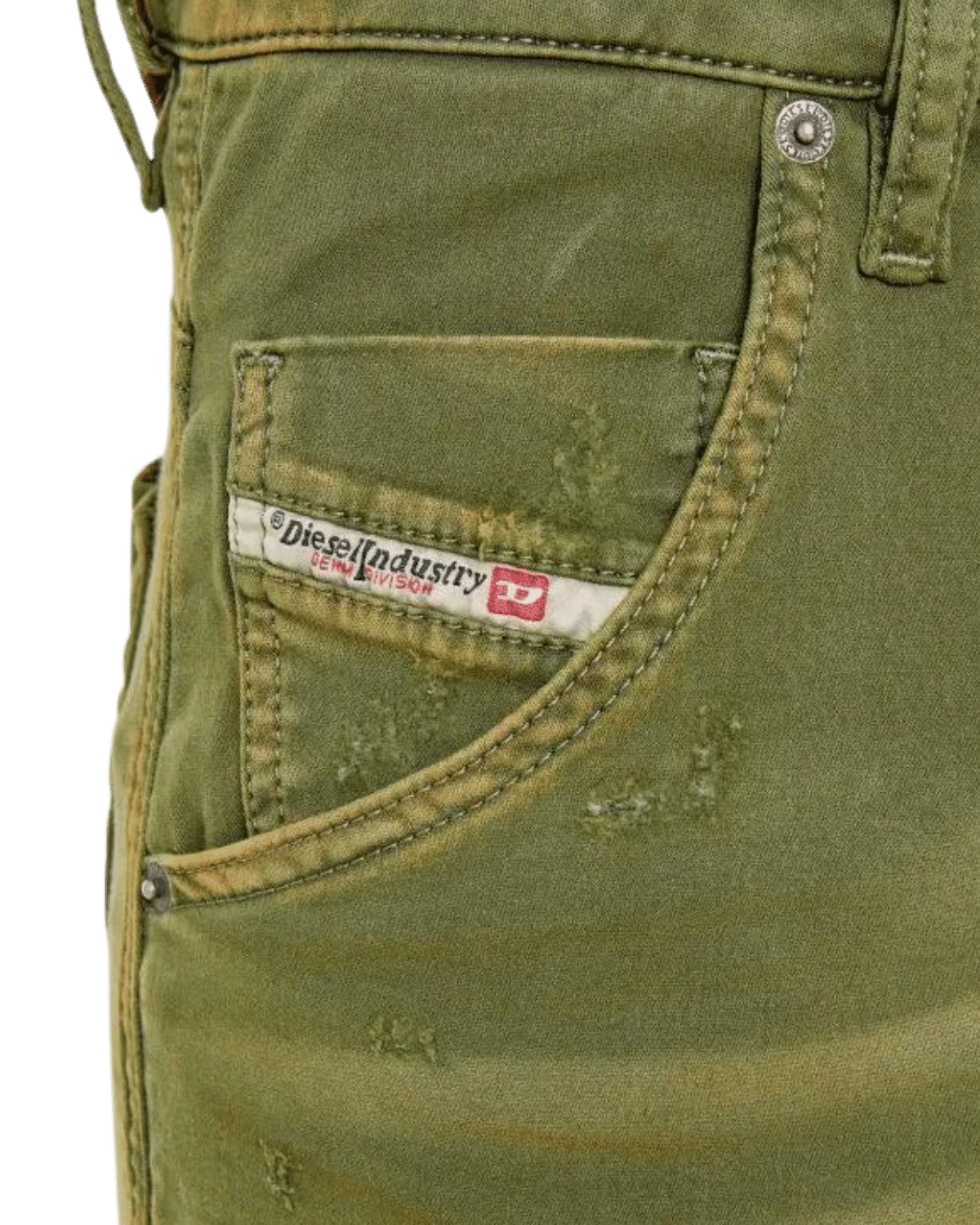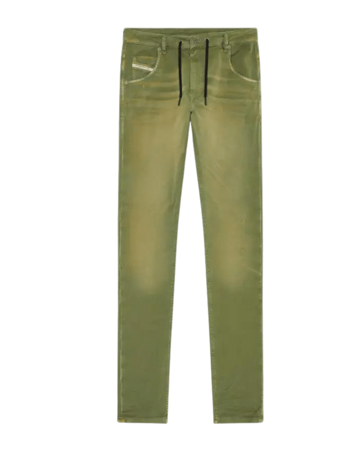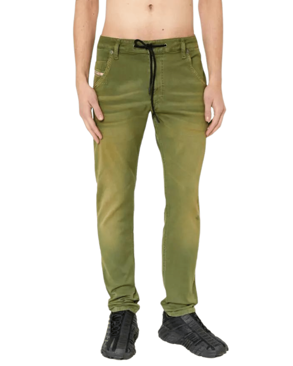 ג׳ינס ג׳וג מבד נעים ונוח בצבע ירוק ובגזרה ישרה עם הצרה קלה בתחתית. לג׳ינס גומי במותן ושרוך קשירה.