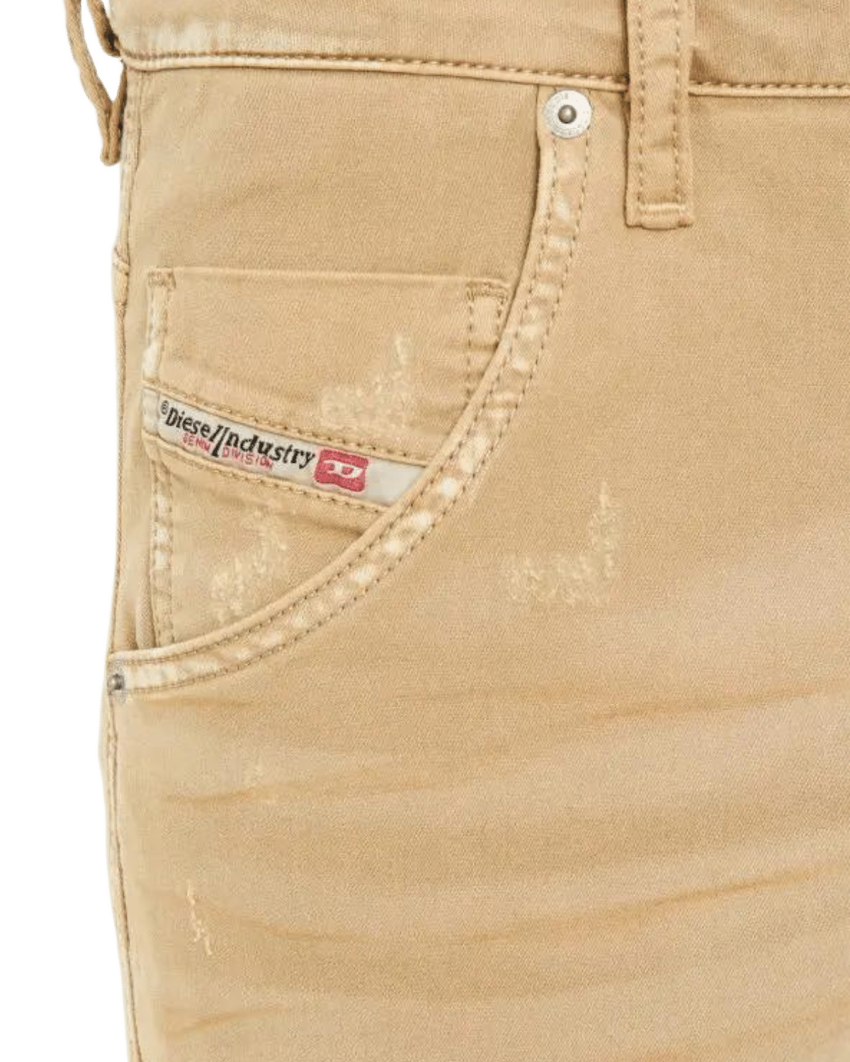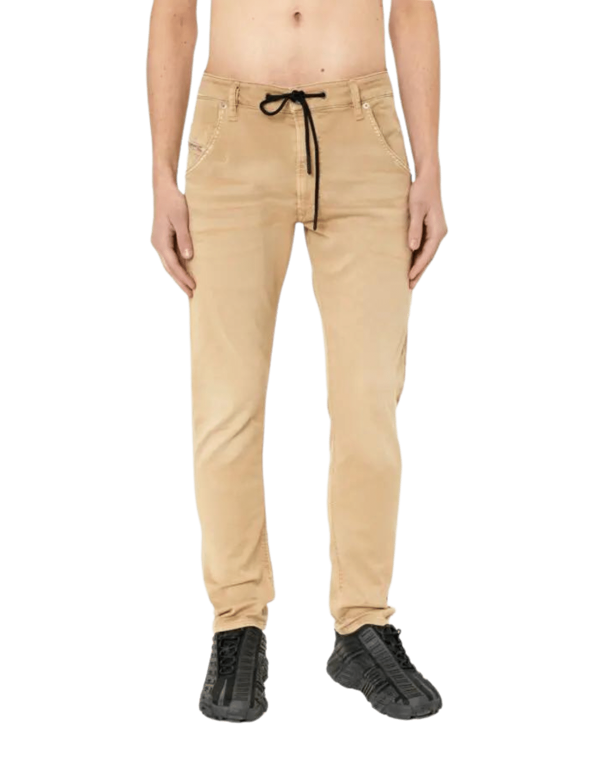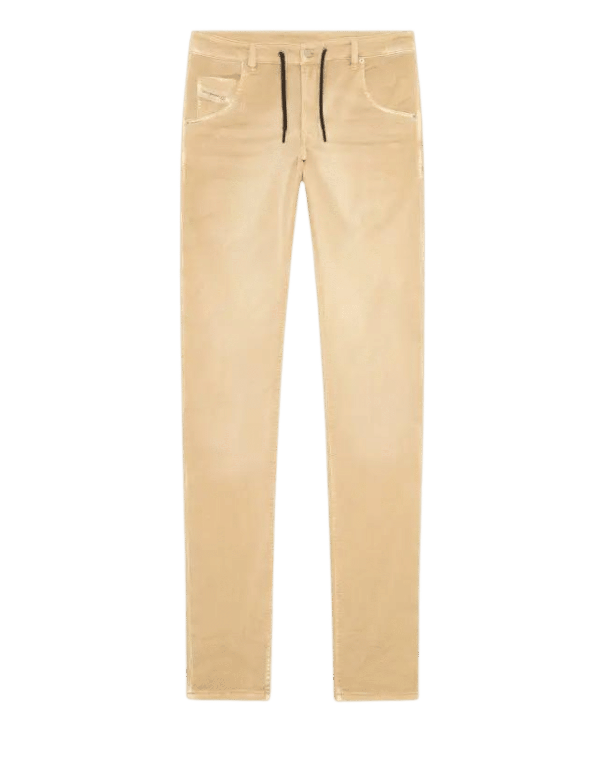 ג׳ינס ג׳וג מבד נעים ונוח בצבע חום בהיר ובגזרה ישרה עם הצרה קלה בתחתית. לג׳ינס גומי במותן ושרוך קשירה.