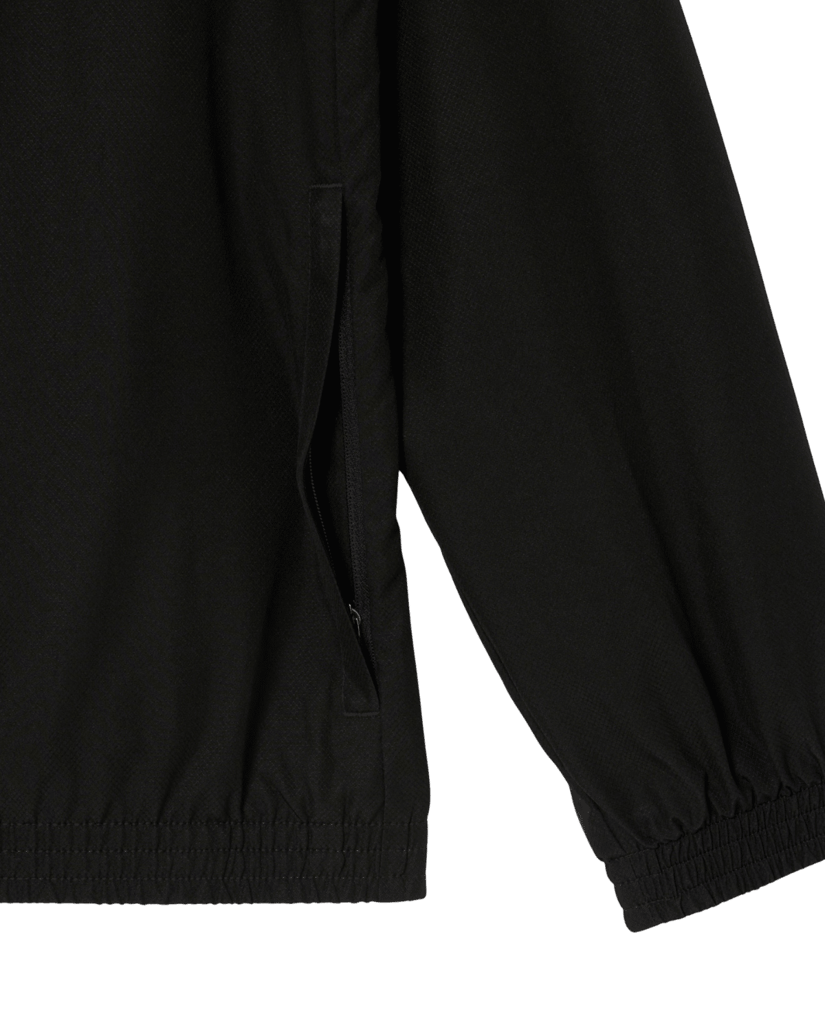 הסט כולל מעיל רוכסן מלא בגזרה נוחה עם צווארון גבוה, פסי מותג מודגשים לאורך השרוולים וכיסים פונקציונליים.
