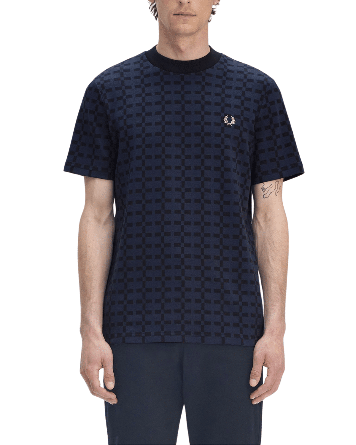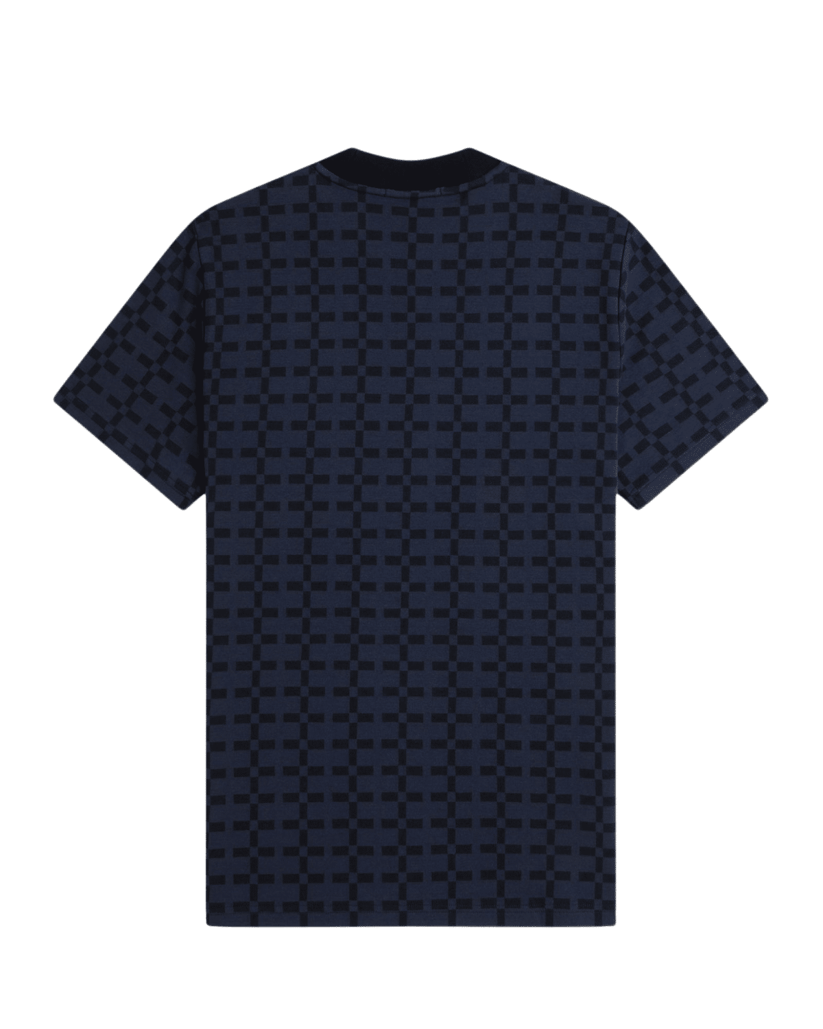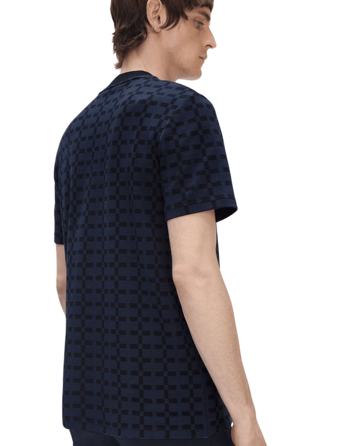חולצת טי שירט לגברים בצבע כחול כהה עם דפוס גרפי חוזר שמשדר אלגנטיות מודרנית עם נוכחות ייחודית.
