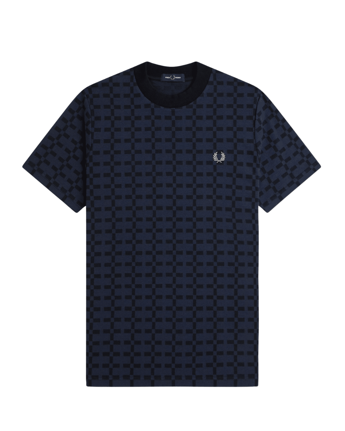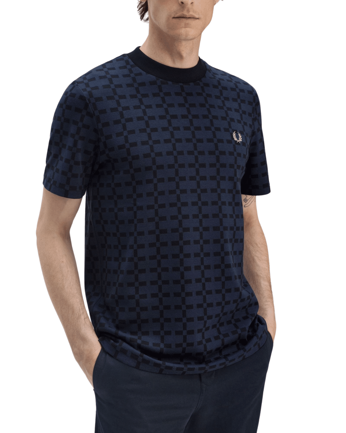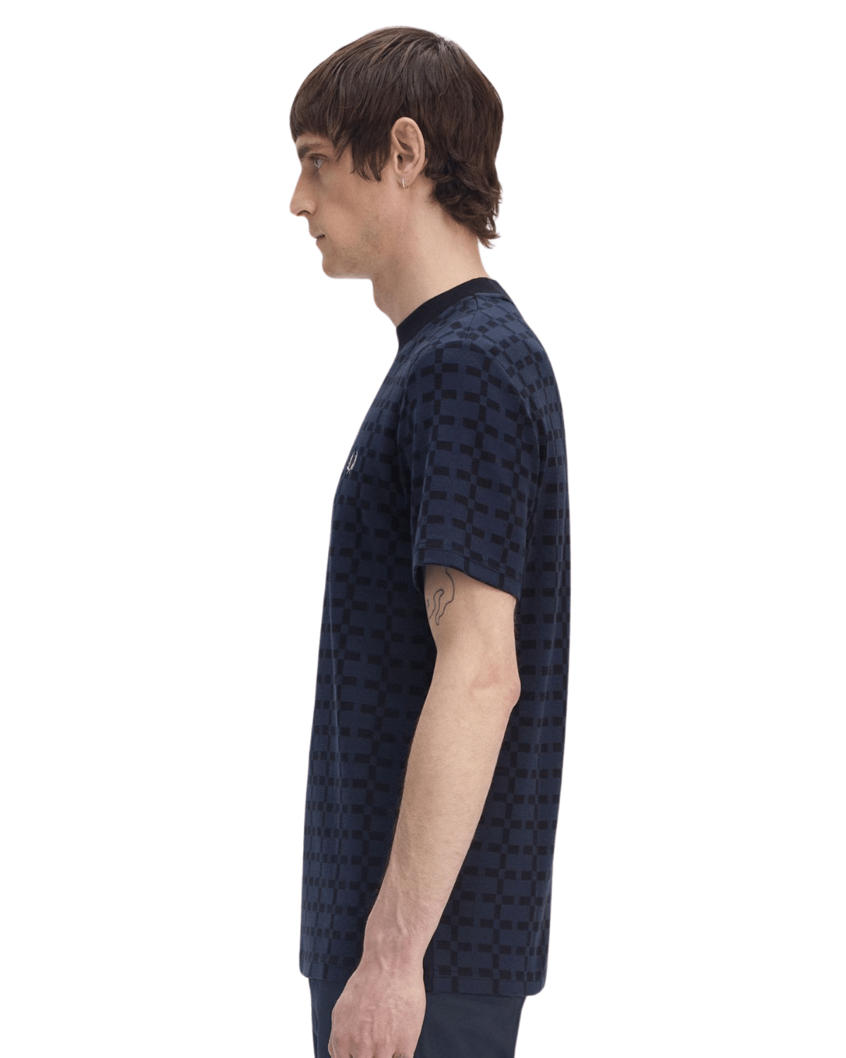 חולצת טי שירט לגברים בצבע כחול כהה עם דפוס גרפי חוזר שמשדר אלגנטיות מודרנית עם נוכחות ייחודית.