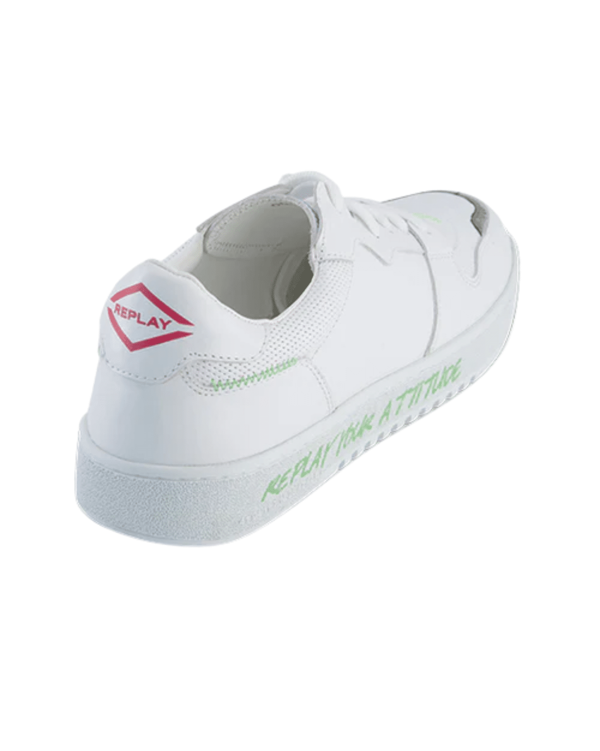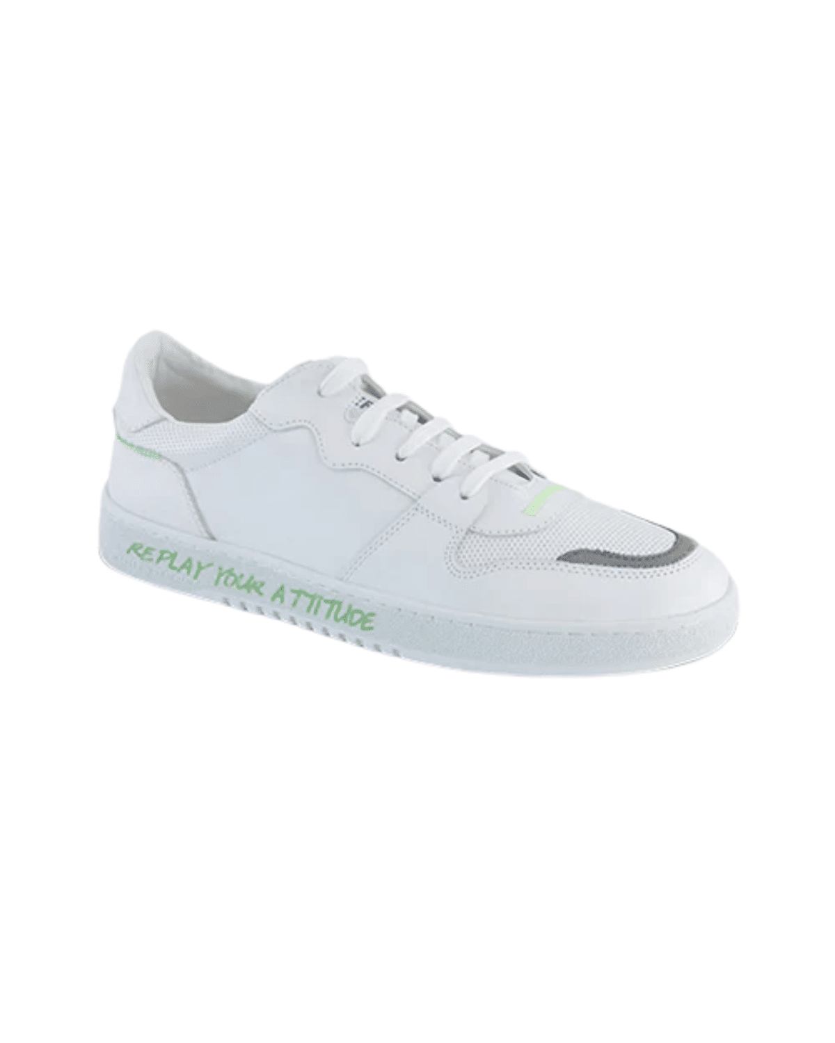 עשויה בשילוב חומרים – עור חלק דמוי עור לצד בד רשת באזורים העמידים יותר, יחד עם סוליית גומי לבנה עבה ומסודרת. הלוגו של REPLAY מופיע בעדינות על הלשונית או הצד החיצוני, והמראה הכללי מוקפד ונקי, אך עם נוכחות חזותית אורבנית.