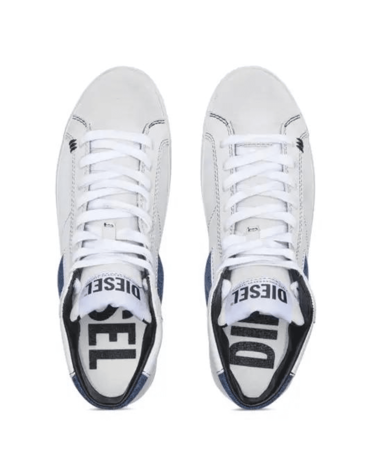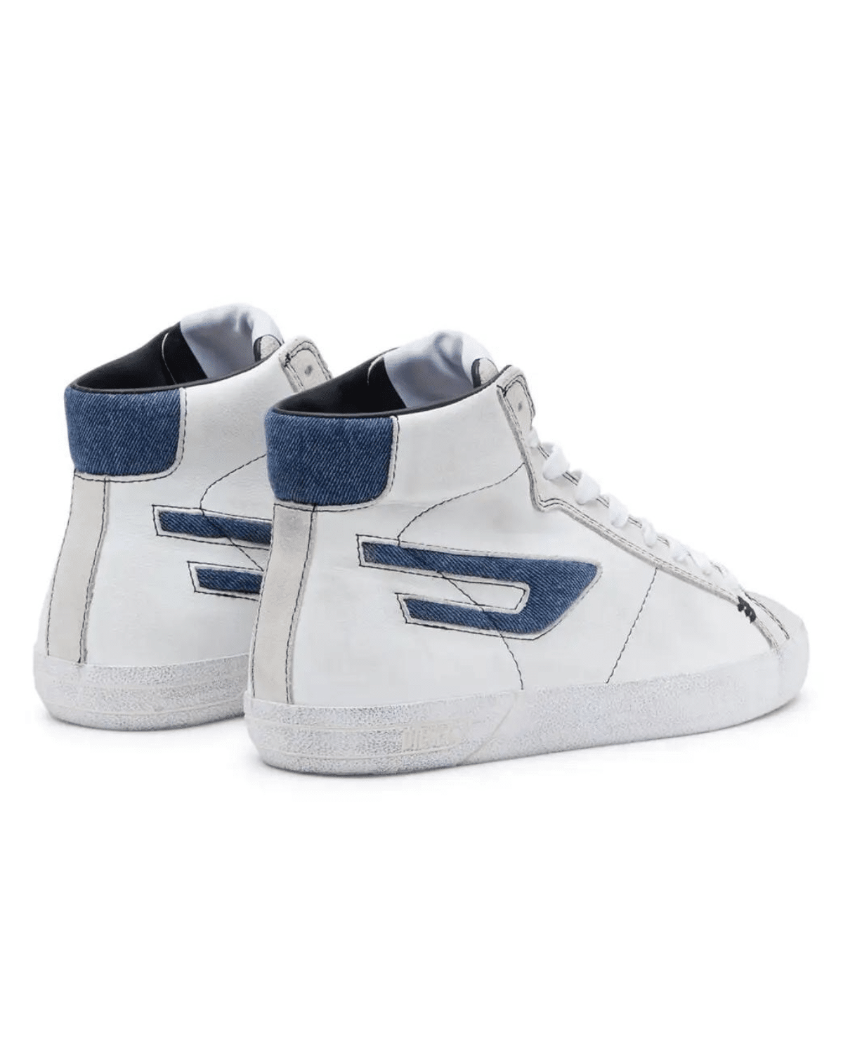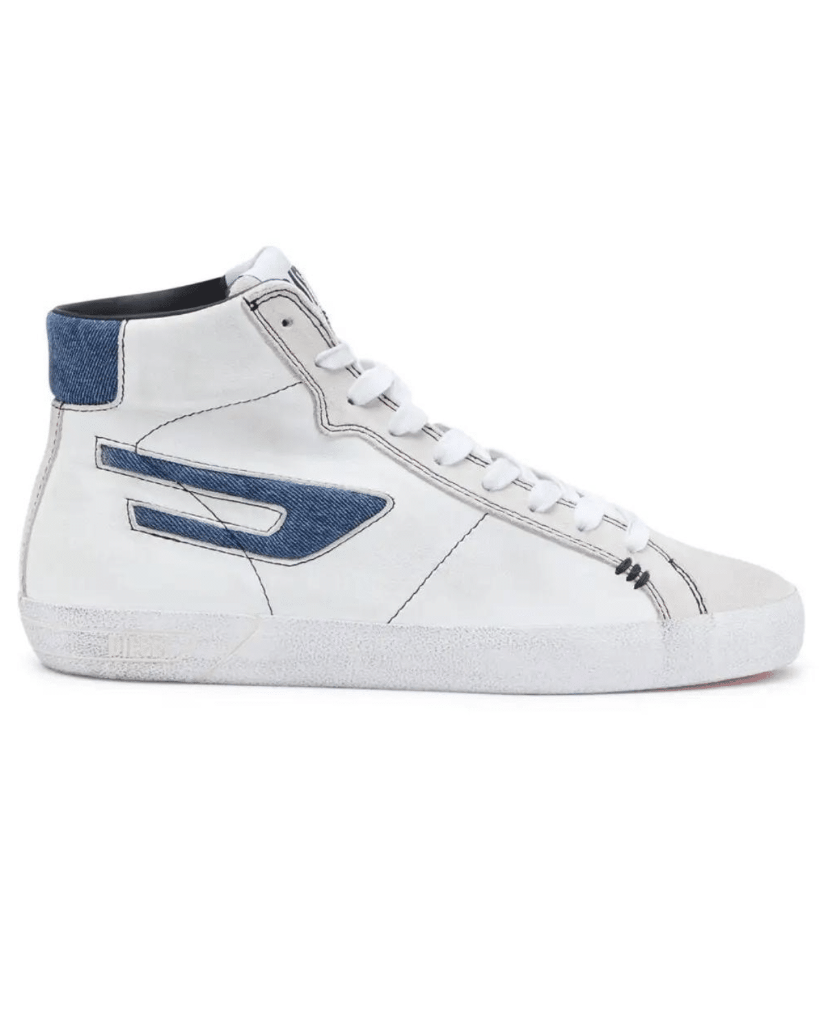 סניקרס גבוהות מעור בצבע לבן בעלות אפקט וינטג' מבית דיזל עם לוגו בצבע גינס נייבי והסולייה בצבע אדום