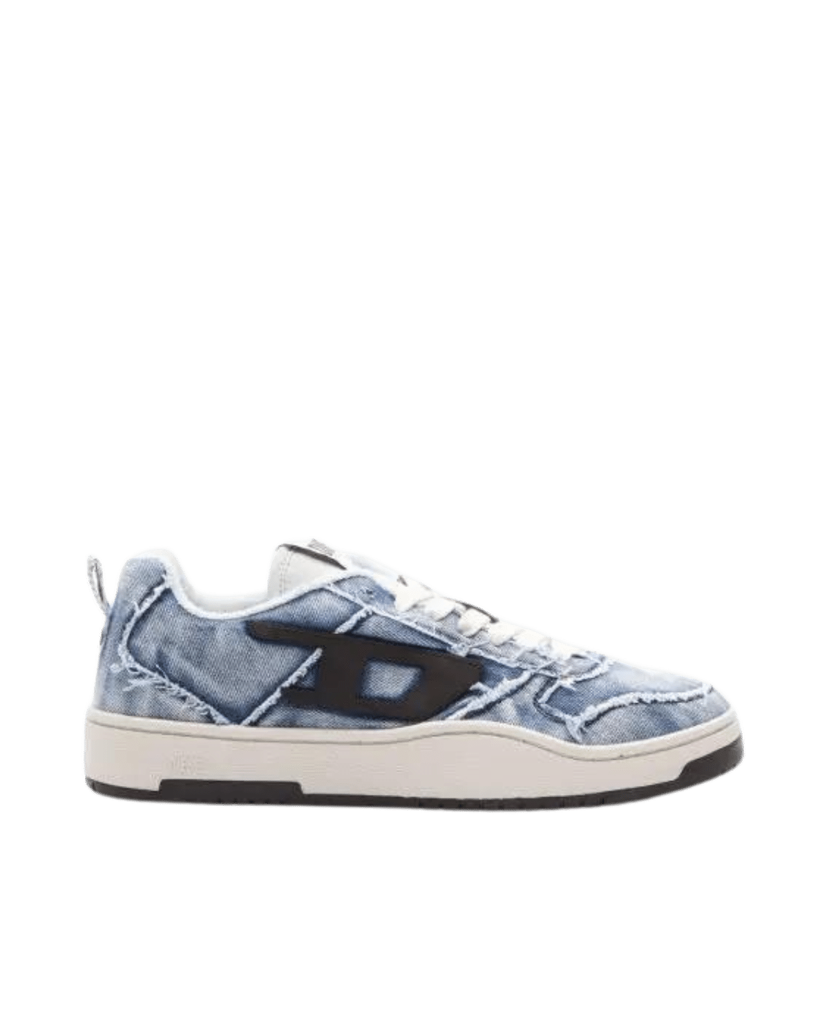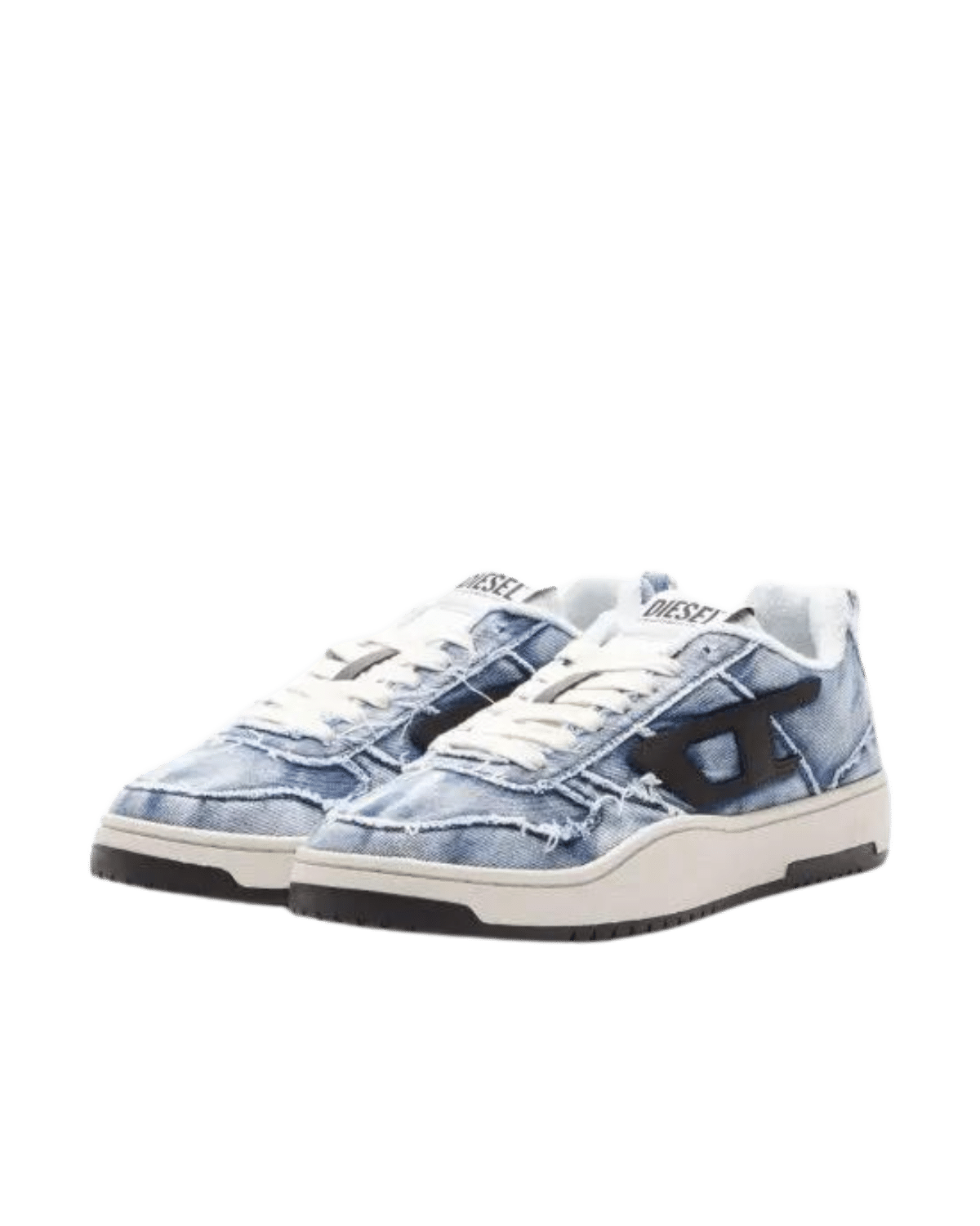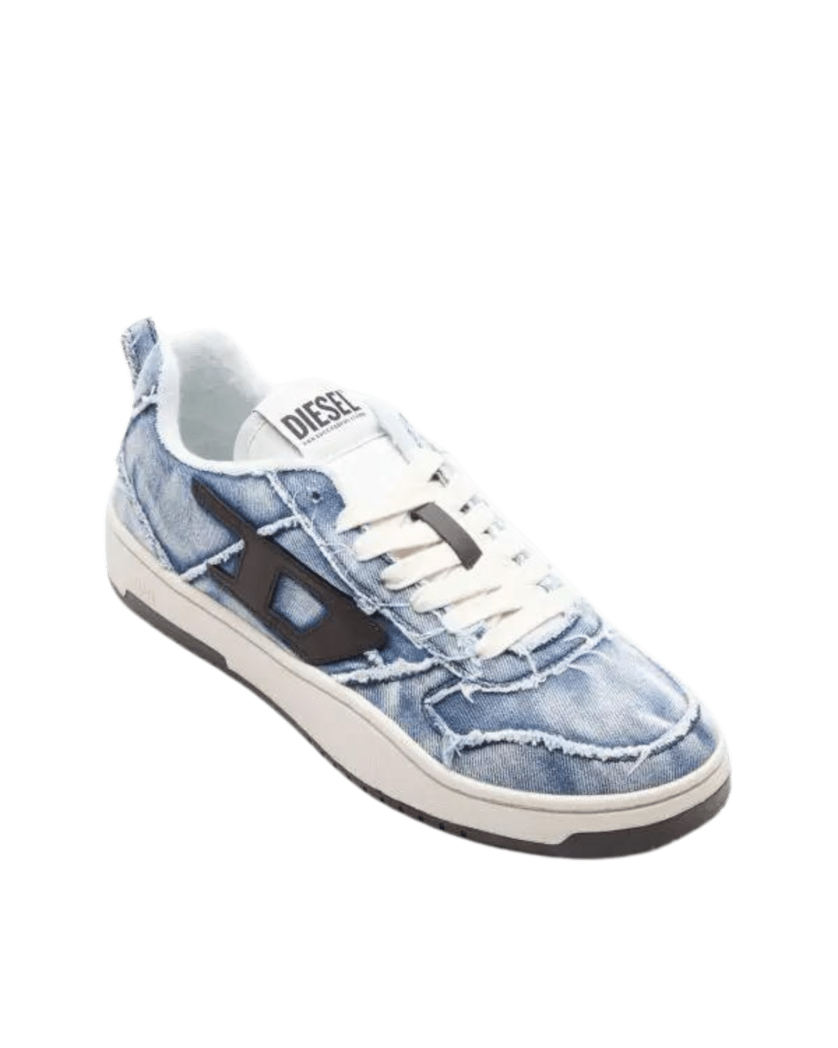 סניקרס נמוכות מדנים בצבע כחול בהיר עם לוגו D שחור ותפרים פרומים.