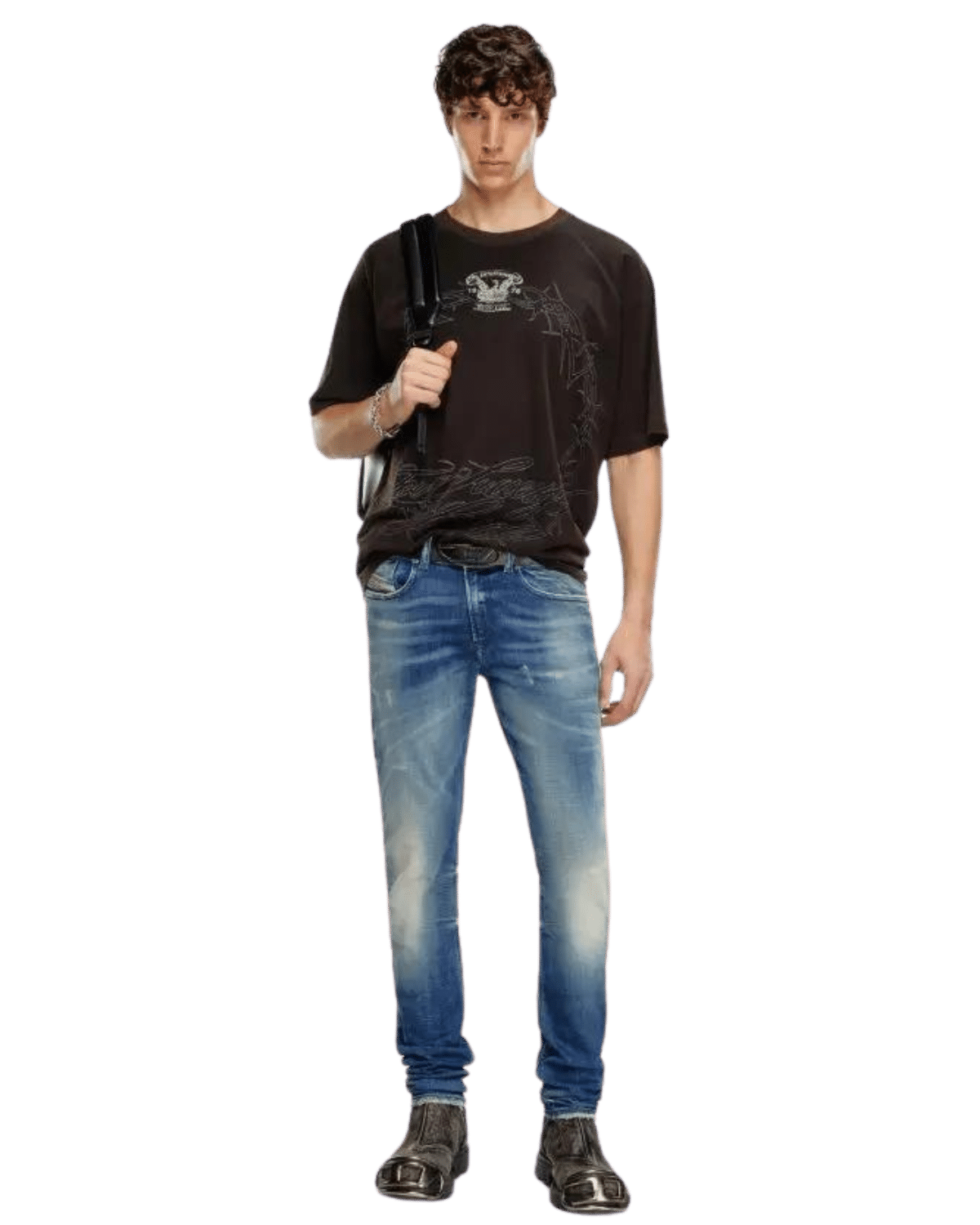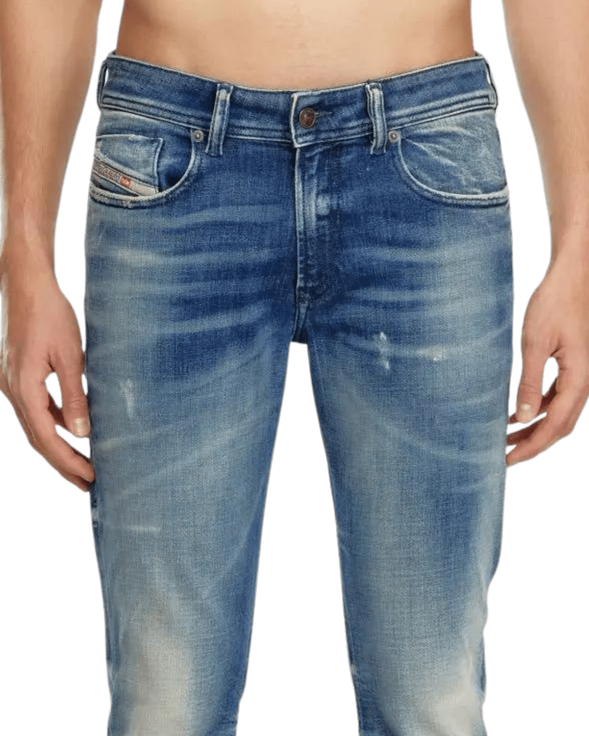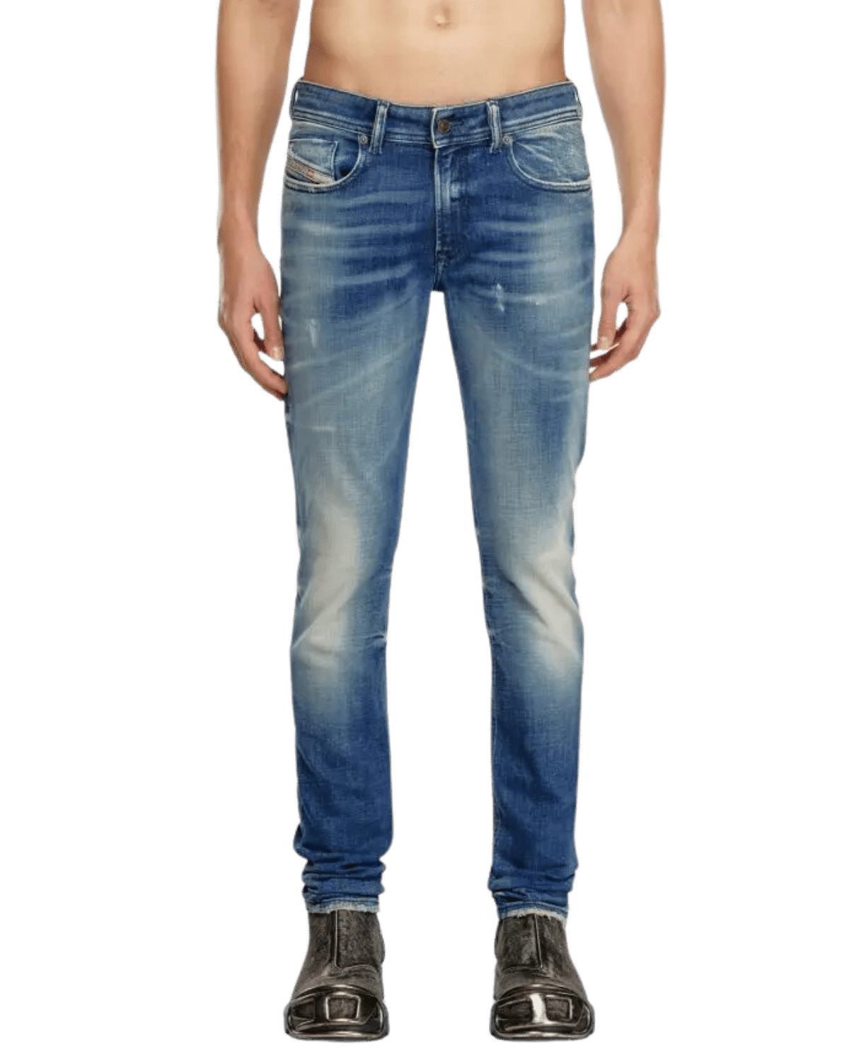 ג׳ינס כחול בגזרת סקיני עם שפשופים וקרעים קטנים.