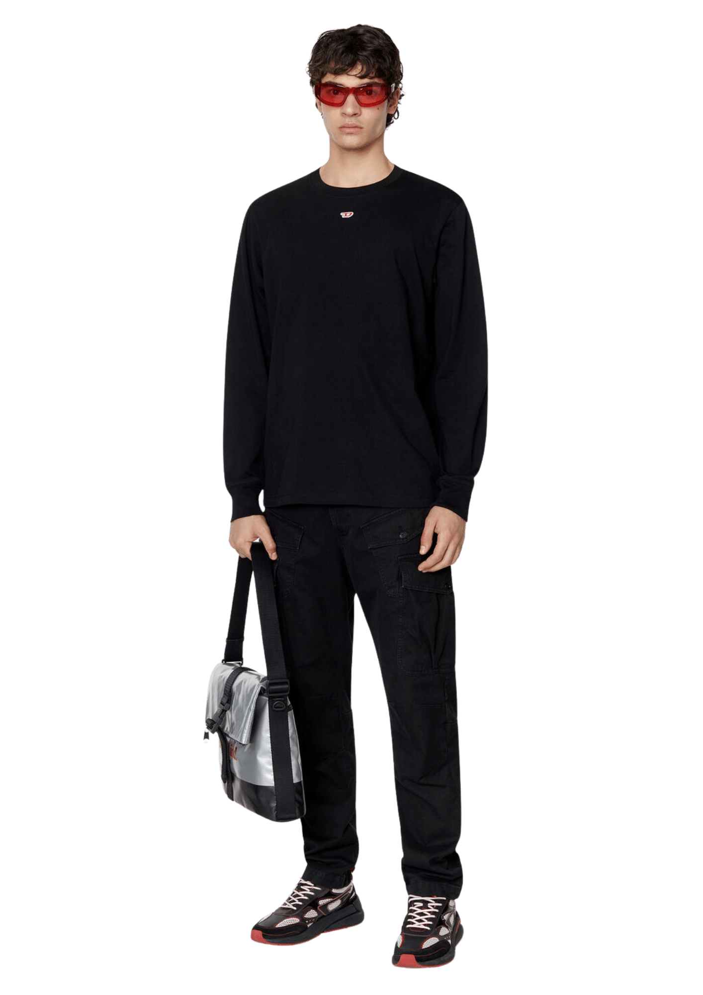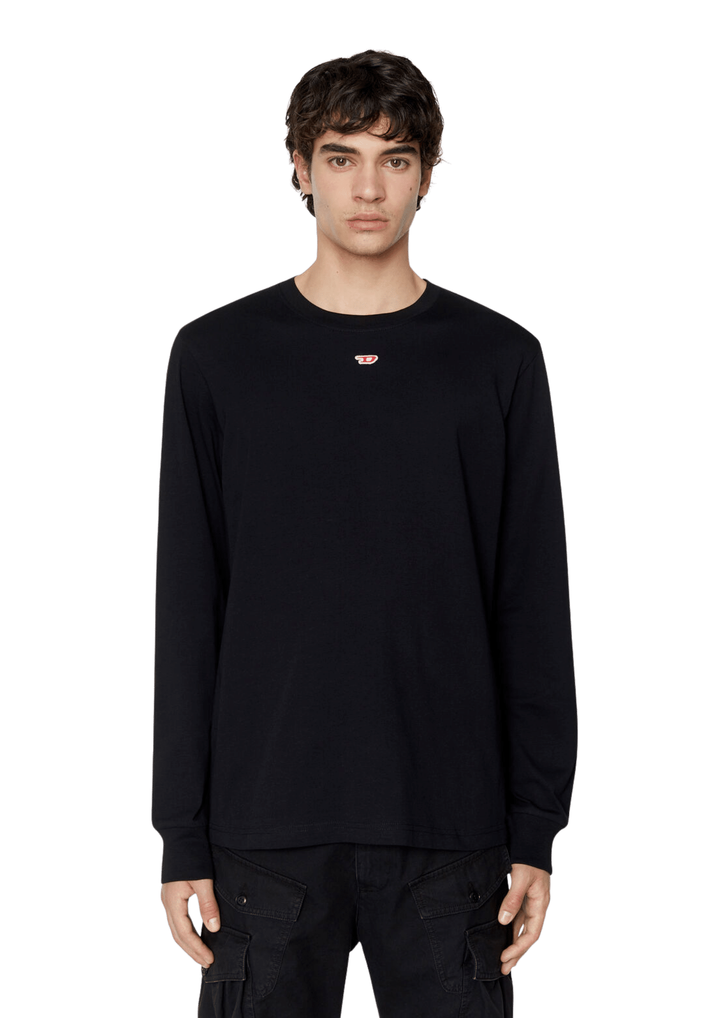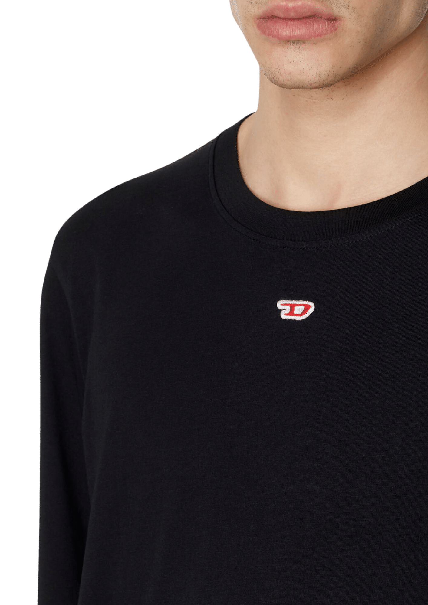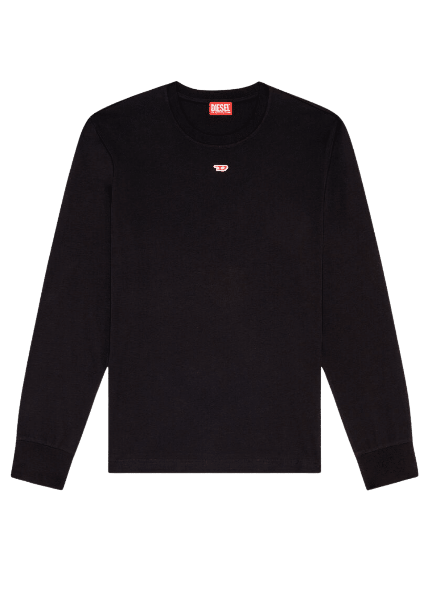 חולצת טי ארוכה לגברים מבית Diesel, בעיצוב נקי וקלאסי בצבע שחור. החולצה מצוידת בשרוולים ארוכים וגוזה עגולה (Crew Neck), ומכילה פאץ’ קטן בצורת האות “D” בצבע אדום בחזית  פריט דיסקרטי שמוסיף טאץ’ מותג אופנתי