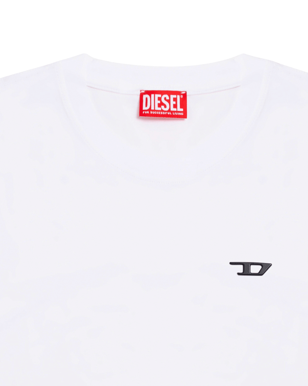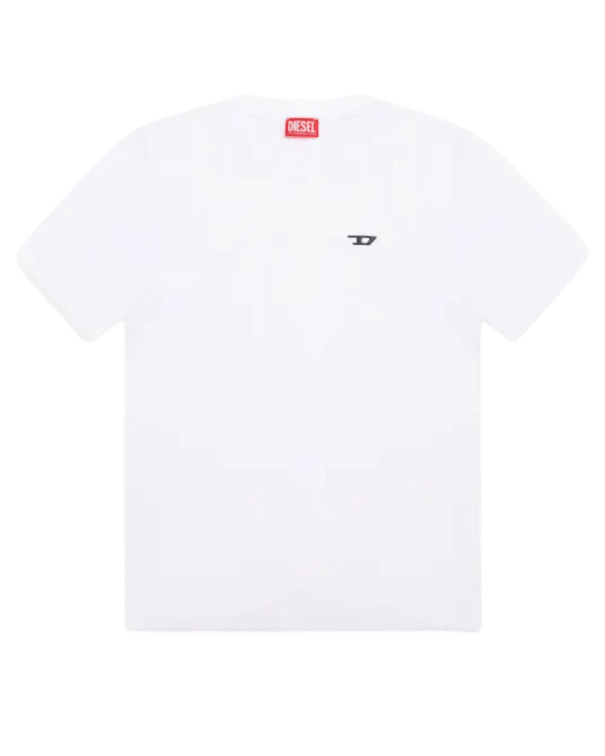 חולצת טי קצרה בצבע לבן עם לוחית לוגו D קטנטנה ממתכת בצד החזה.