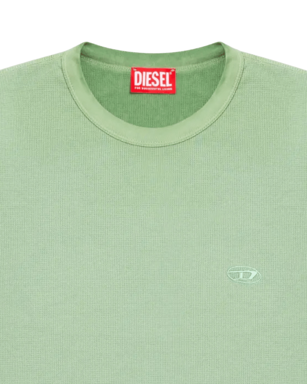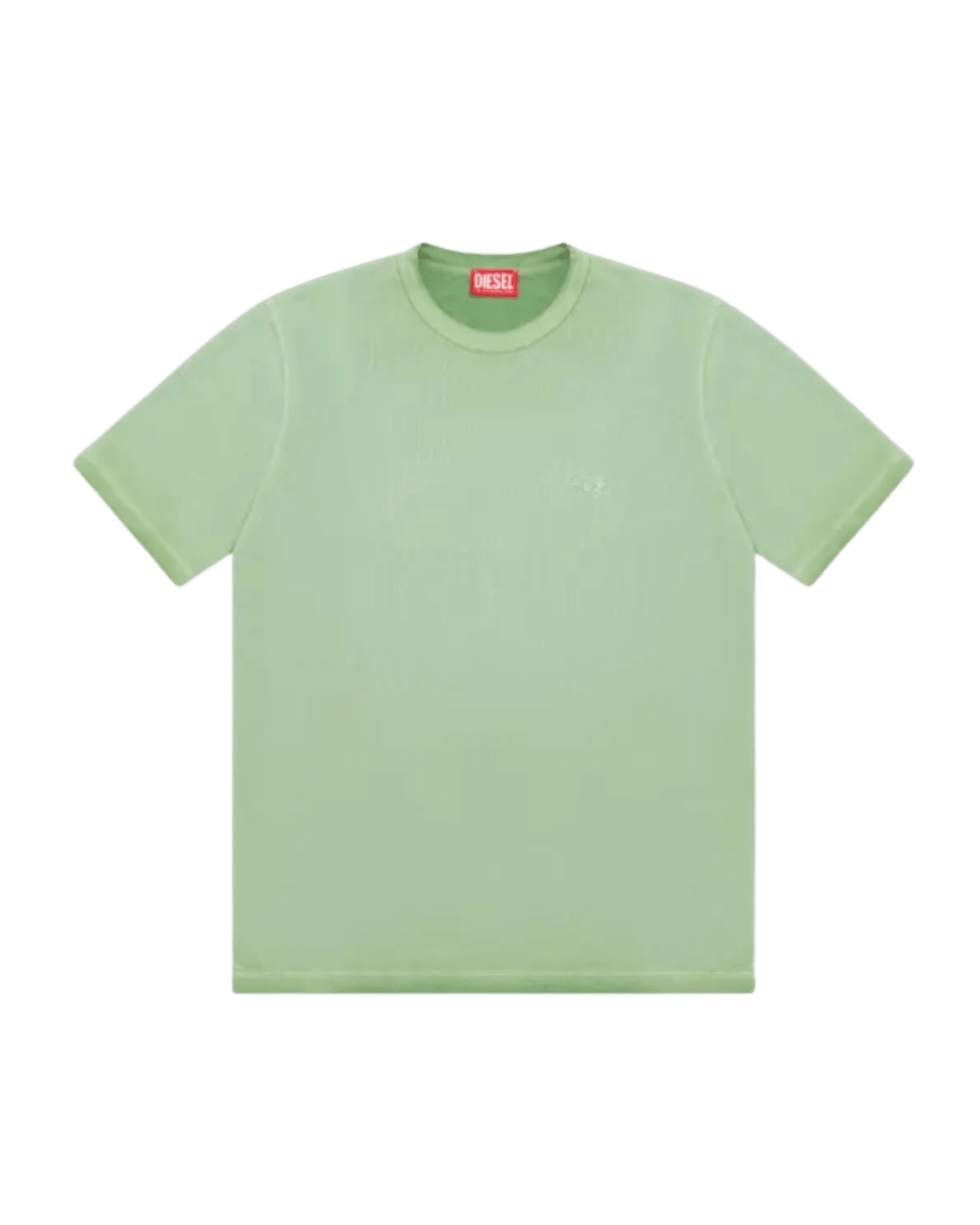 חולצת טי קצרה בצבע ירוק מנטה מכותנת ג׳רזי בטקסטורת פיקה, עם רקמת לוגו D קטנה.