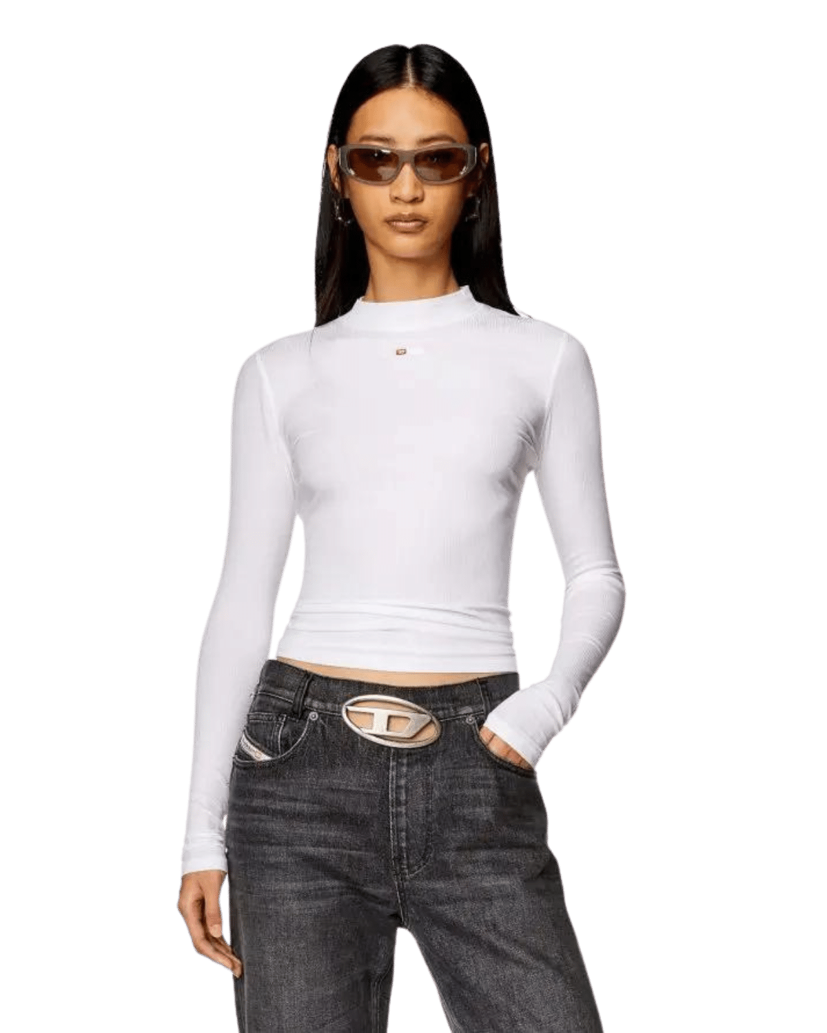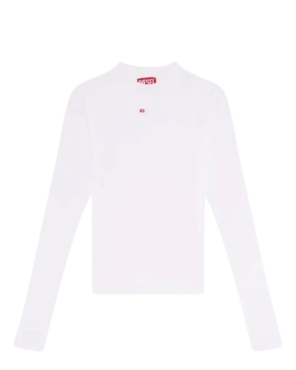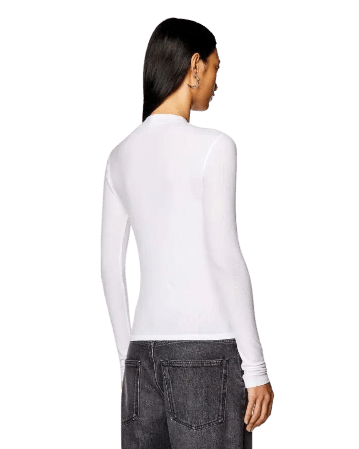 חולצה ארוכה לבנה מבד ריב ג׳רזי בגזרת סלים, עם צווארון חצי גולף והדפס לוגו קטן.