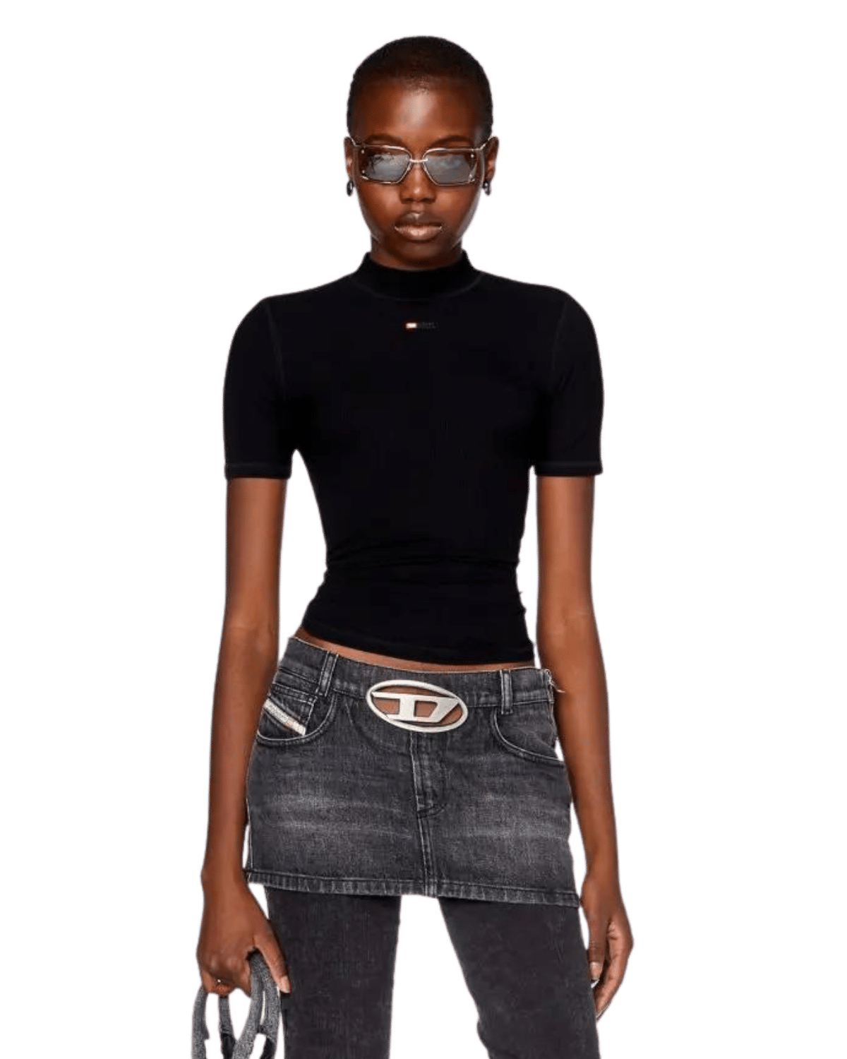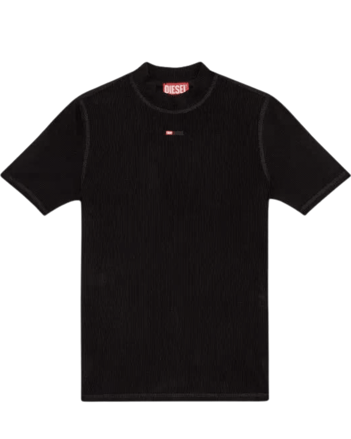 חולצה קצרה שחורה מבד ריב ג׳רזי בגזרת סלים, עם צווארון חצי גולף והדפס לוגו קטן