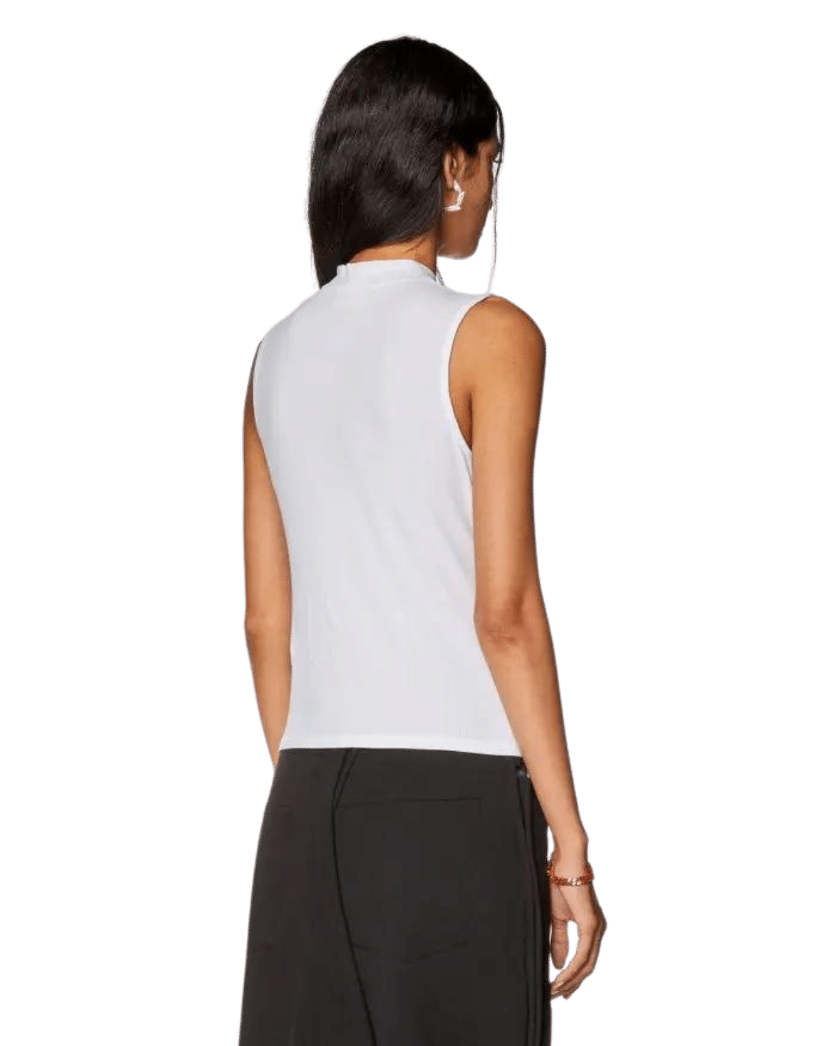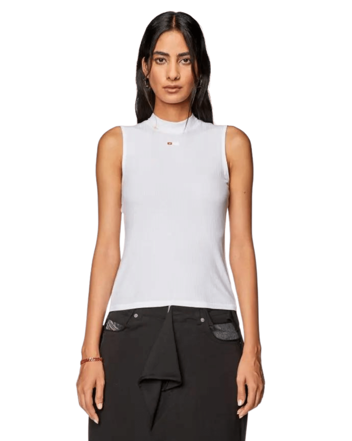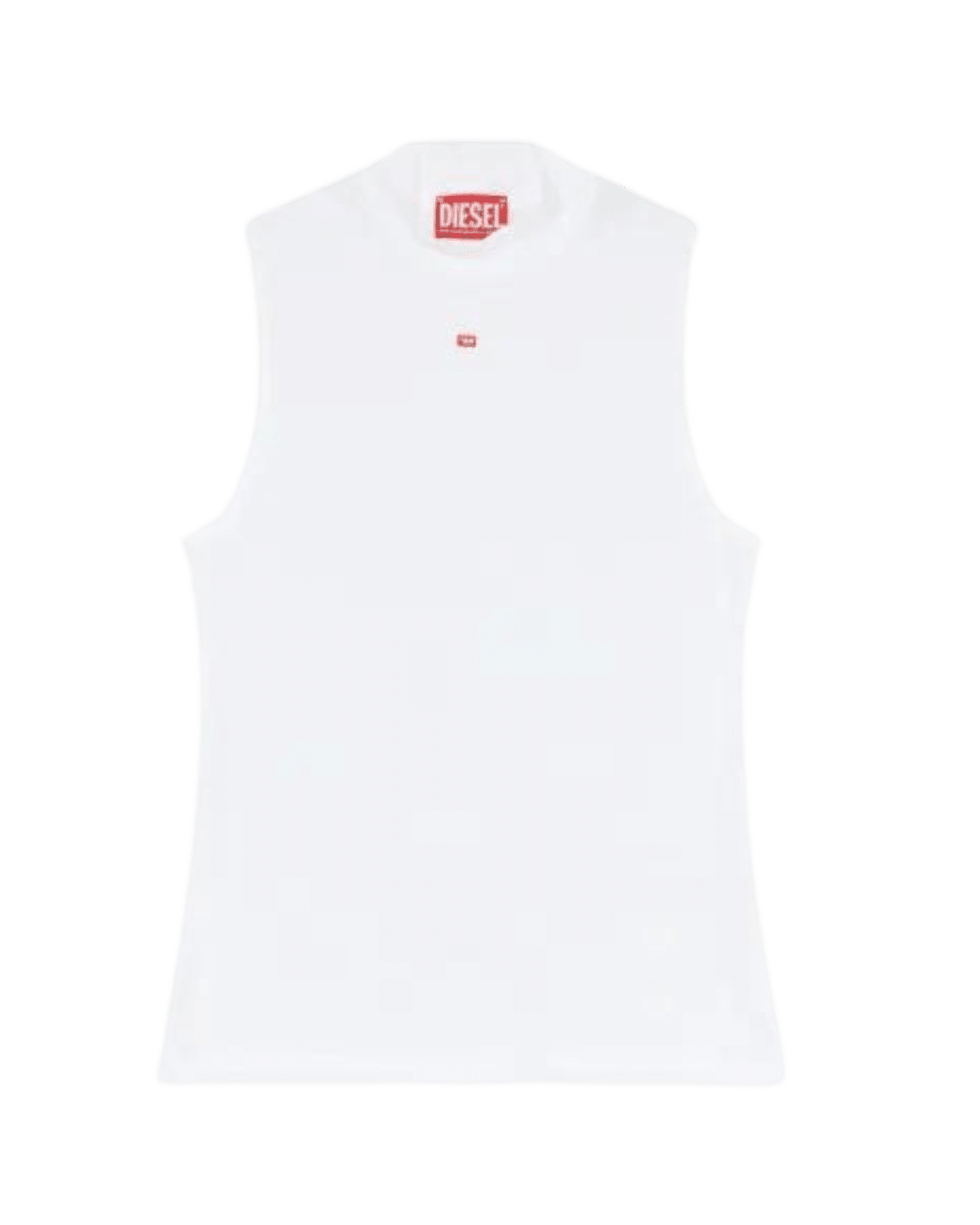 גופייה לבנה מבד ריב ג׳רזי בגזרת סלים, עם צווארון חצי גולף והדפס לוגו קטן.