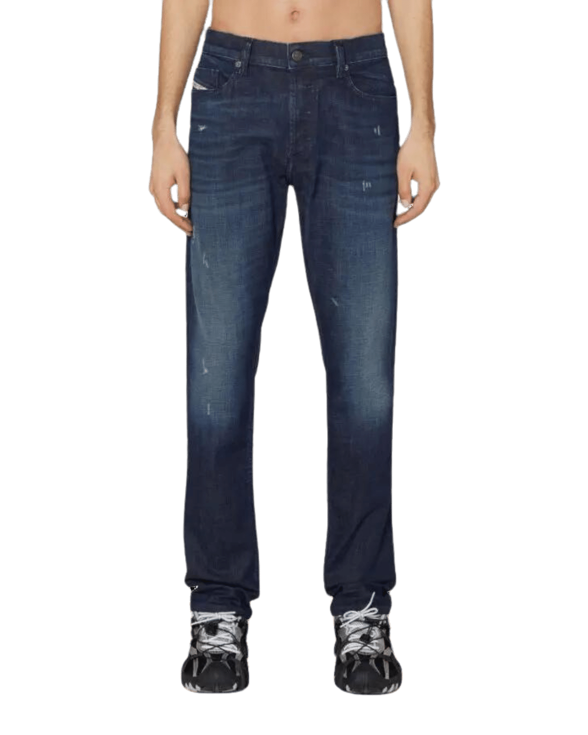 ג׳ינס כחול בגזרה מעט משוחררת במותניים והירכיים וצרה מהברכיים ומטה, עם שפשופים קלים.Slim Jeans Tepphar 09J41