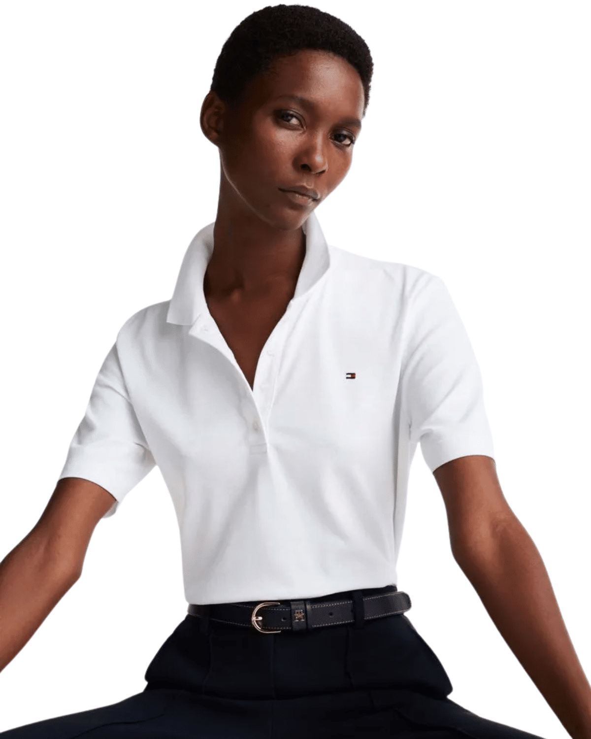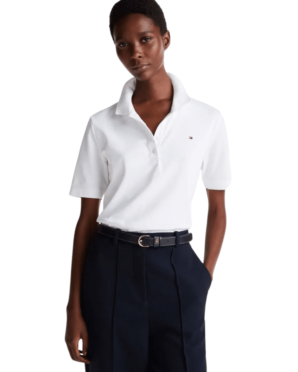 חולצת פולו קצרה לנשים  בצבע לבן מבית טומי הילפינגר היא פריט על-זמני שמשלב בין סגנון אלגנטי לנוחות מקסימלית