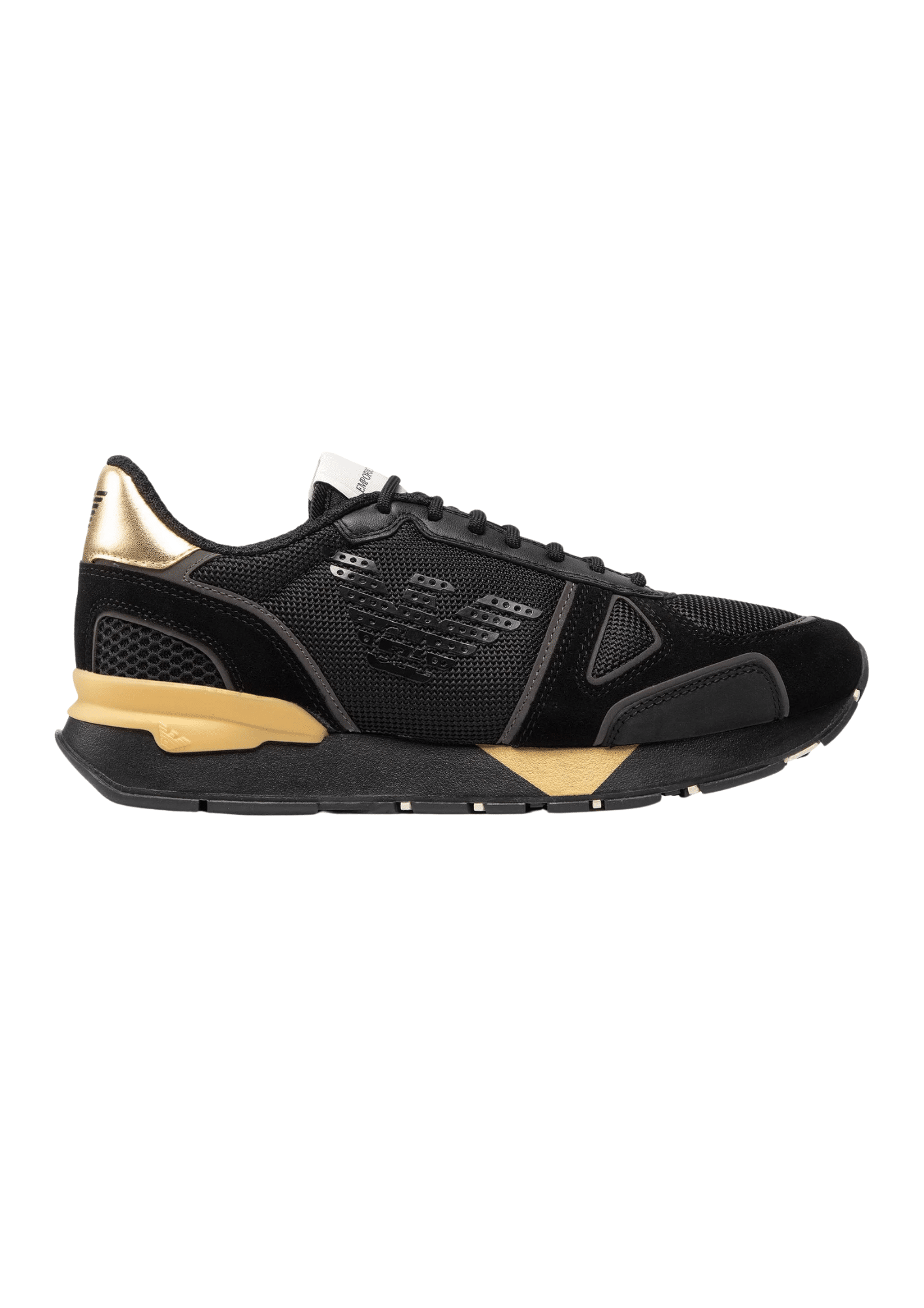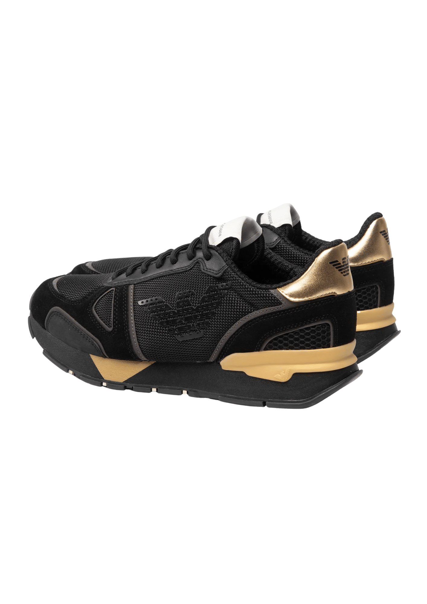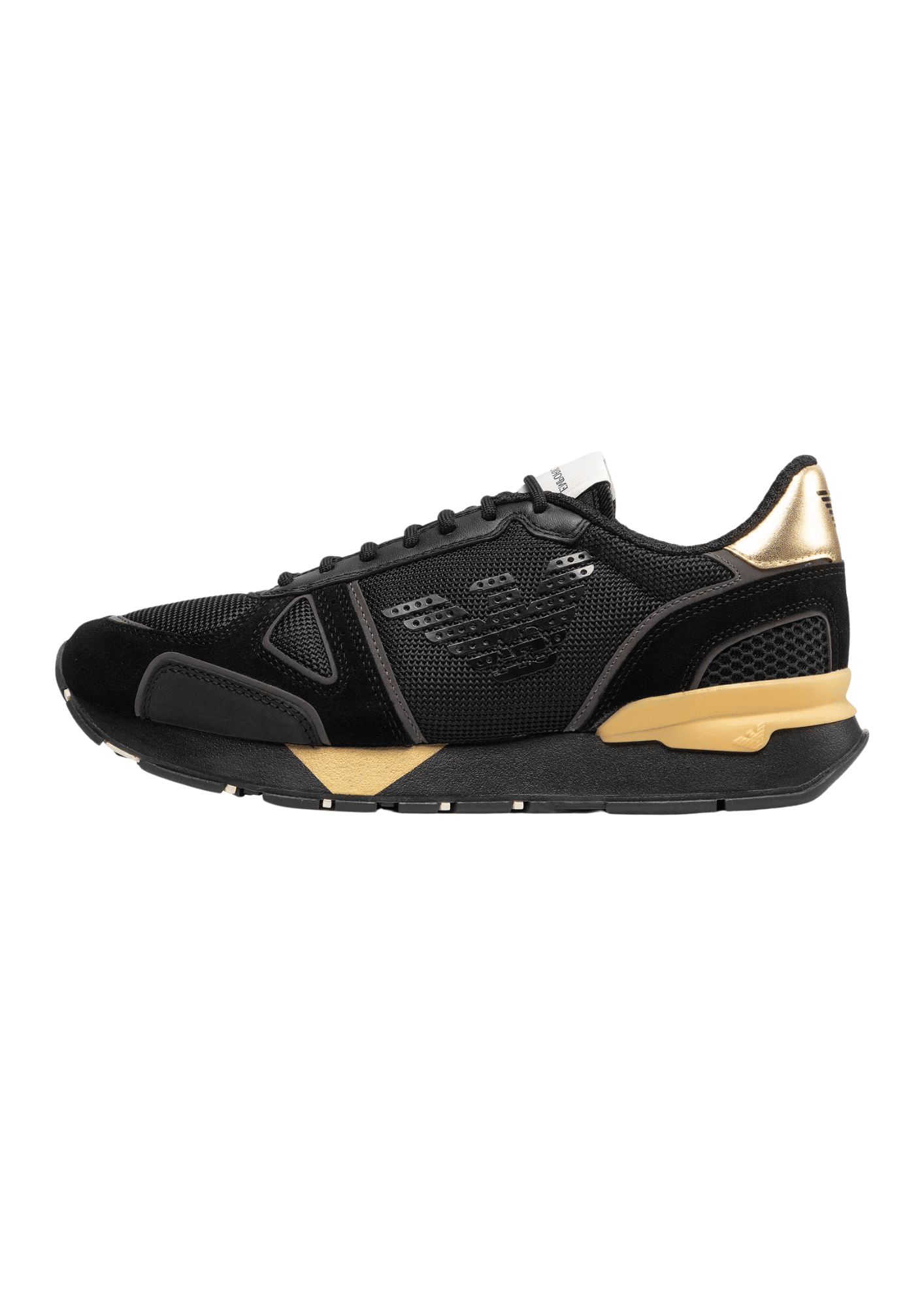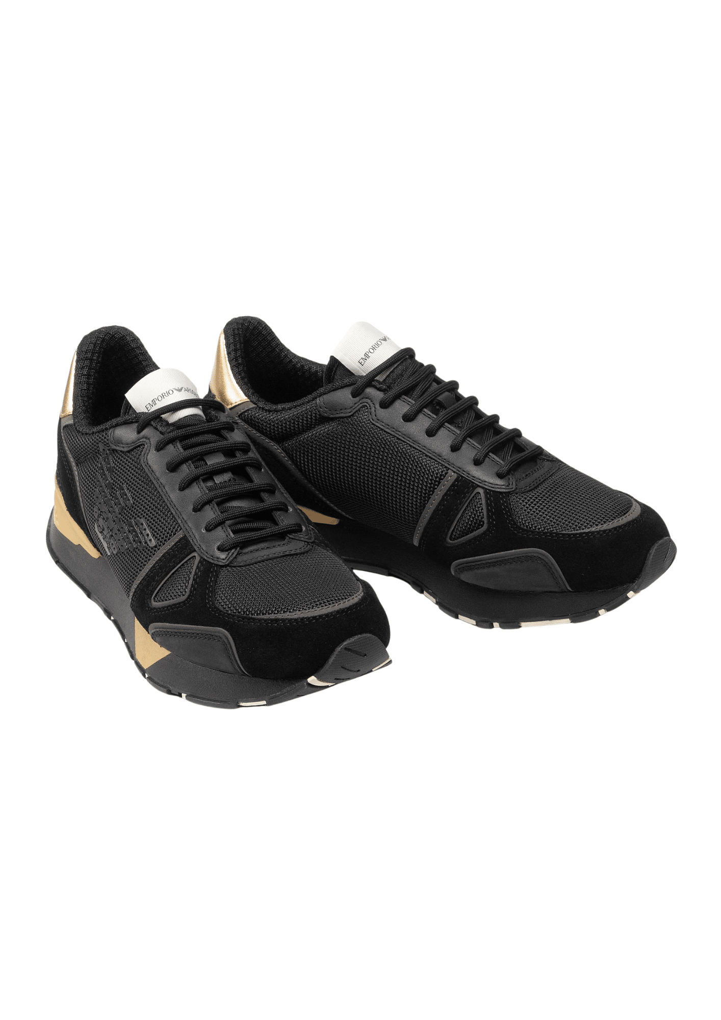 נעלי סניקרס לגברים מבית Emporio Armani בגוון שחור עם זהב, שמעניקות מראה יוקרתי-ספורטיבי.
